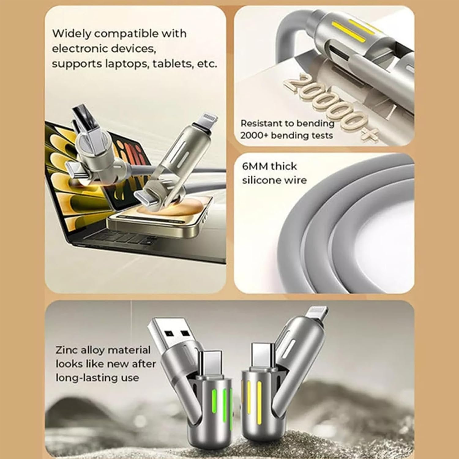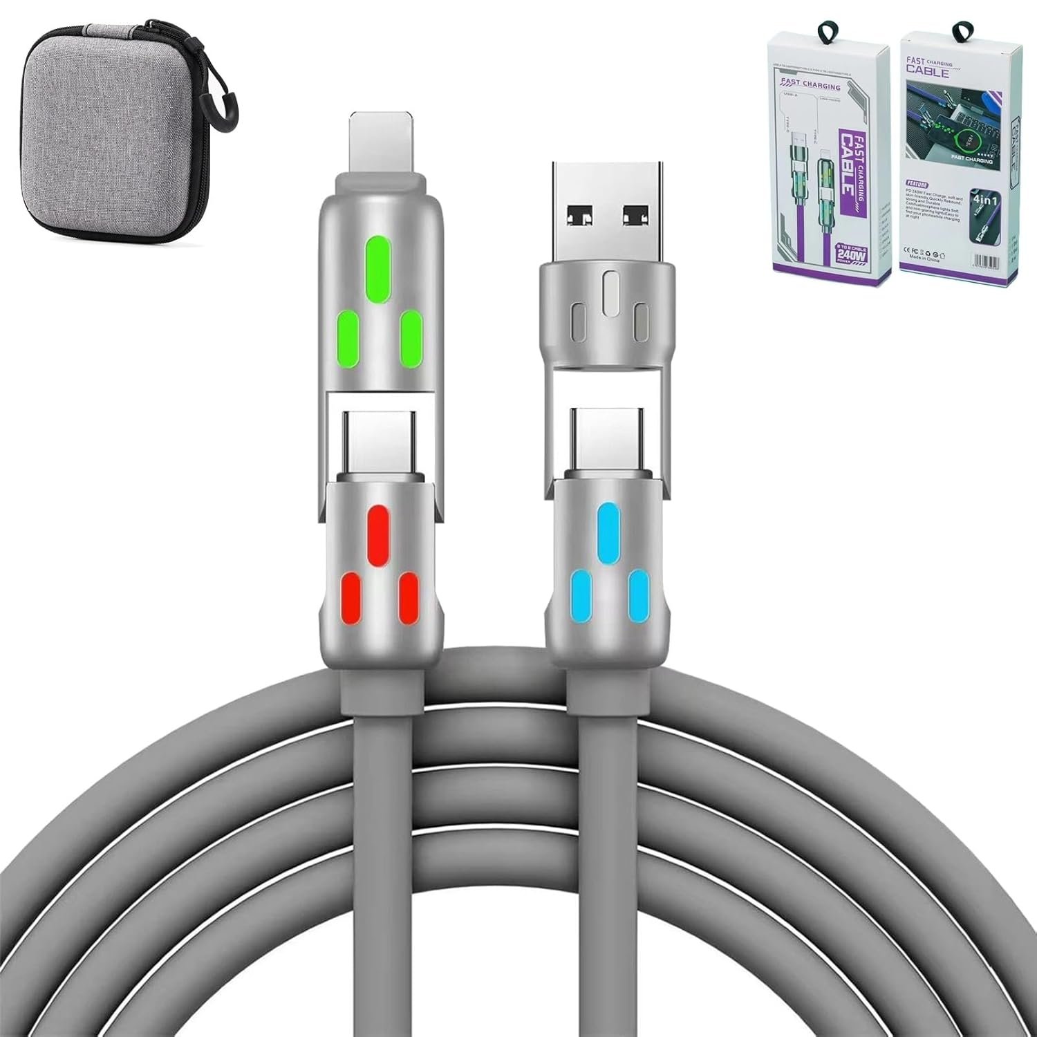 Versatile 4-in-1 Multi-Charging Capability: No more juggling multiple cables! Say goodbye to juggling multiple cables! This 240W 4-in-1 USB charging cable is compatible with a wide range of devices, offering a versatile and convenient solution for all your gadgets. Ideal for home, office, or travel, it streamlines your charging routine with ease