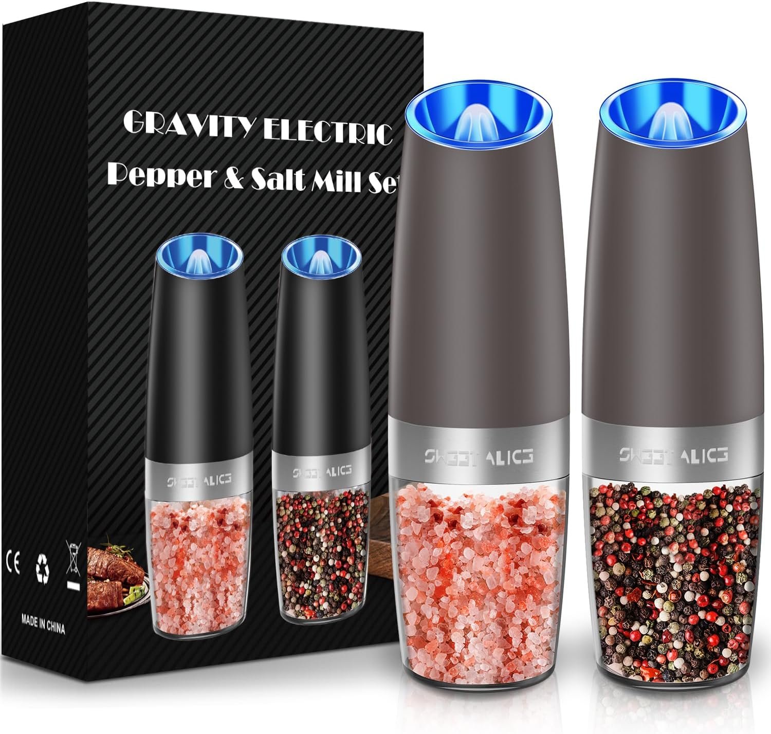 Sweet Alice Gravity Electric Pepper and Salt Grinder Set, Adjustable Coarseness, Battery Powered with LED Light, One Hand Automatic Operation, Brown, 2 Pack