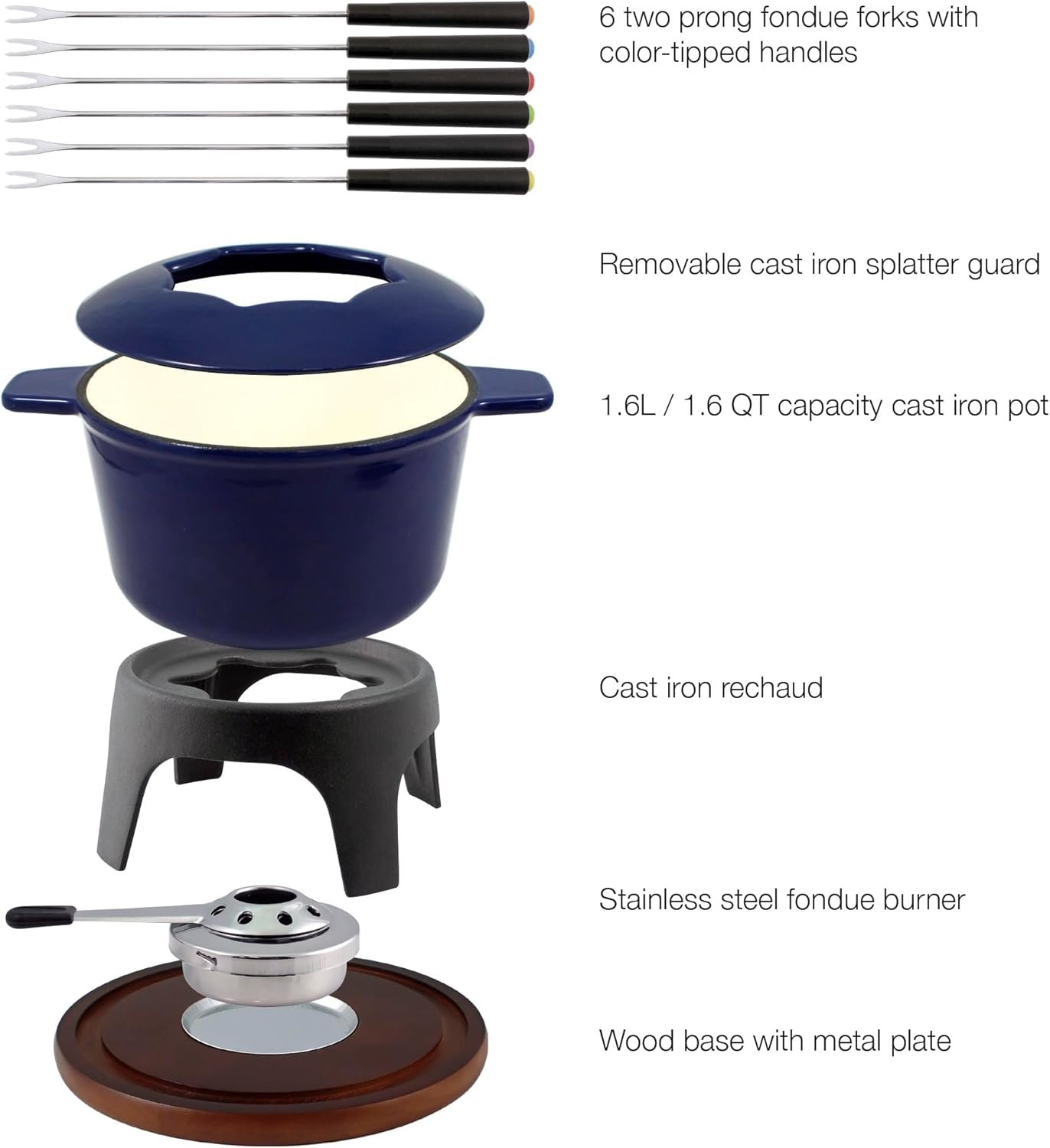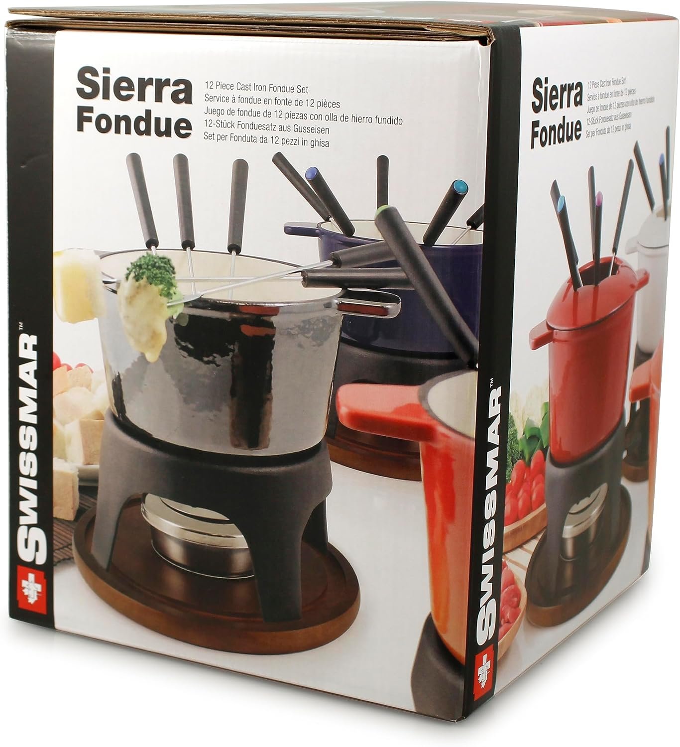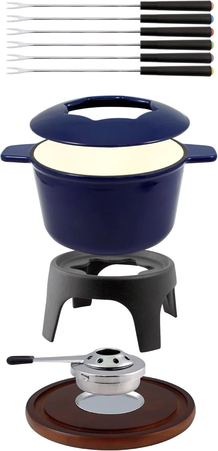 Having graduated well beyond the 1960s culinary craze, fondue cooking remains a creative way to gather friends at the table for a deliciously entertaining experience. Swissmar’s Sierra 11-piece meat fondue set specializes in heating oil or broth to an even, consistent temperature for dipping bite-sized dinner treats such as beef, chicken, seafood, or pork. Crafted of enameled cast iron, the wide, straight-sided pot holds a generous 1.6 quarts of liquid and can be preheated on a stovetop or warmed directly over the fondue flame. Cast iron is an ideal choice for meat cooking, as it works well at both low and high temperatures and, though it takes a few minutes to heat up, provides excellent heat distribution and retention. The matching rechaud stands on three sturdy legs with high arches between to easily access the paste/gel fuel burner. Below, a handsome light wood base is carved with a groove to securely hold the entire fondue set while protecting tabletops from heat and drips.When the liquid inside is bubbling nicely, it’s time to dig in. For safe, cool handling, there are two wide handles as well as a removable splatter guard that fits snugly on the pot with slots for the six forks. Diners choose a color on the tip of each fork so it’s easy to identify and store even when there’s much dipping and stirring (not to mention talking and laughing!). For multipurpose usage, simply remove the splatter guard and lower the heat to melt cheese, or use the pot as a warmer for appetizers, buffet items, chilis, or soups. Available in an array of bright colors including red, blue, white, and orange, this fondue set has a cheerful presence that suits its inviting, communal purpose. Assembled, the set measures 8-1/4 inches high by 8 inches in diameter, and wide handles assist in transporting the 6-3/4-inch pot. Easy recipes are included to get the party started.