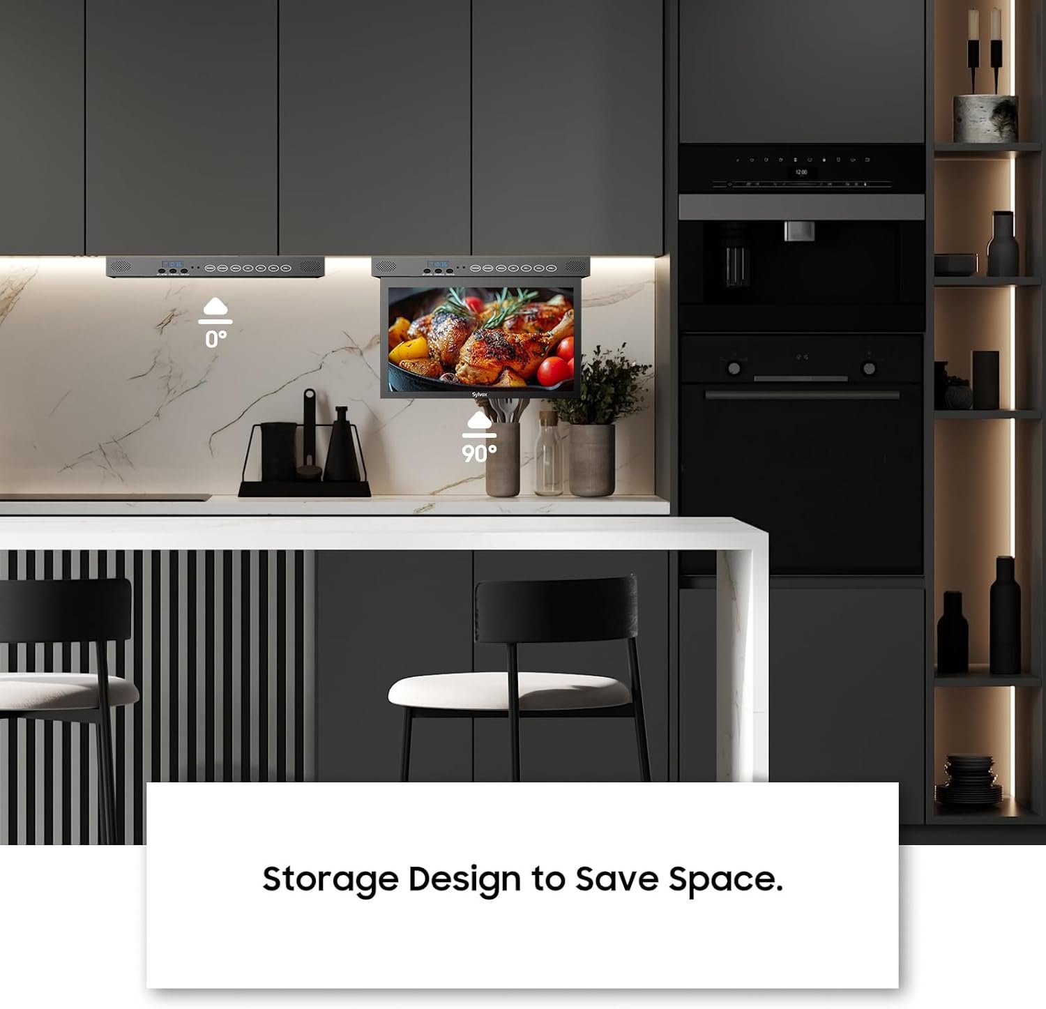 Flap-Down kitchen TV: Designed for the kitchen, the screen can be rotated from many angles. Storage design, beautiful, and save space in the kitchen.