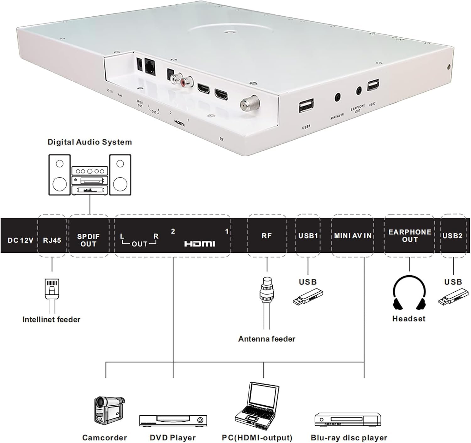 mini AV, CEC&ARC*2, Line (L/R) out, RF, Earphone, USB*2