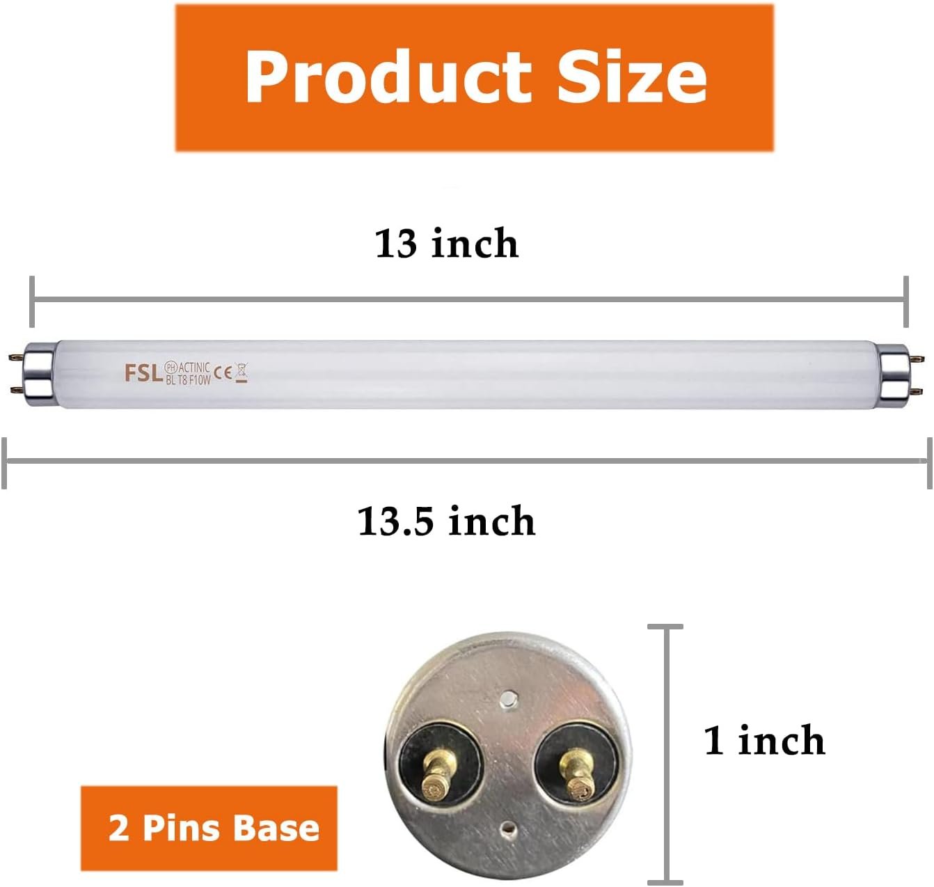 SPECIFICATION: Bulb size: 13L x 1W x 1H inch Total length including pins on both sides 13.5 inch Power: One bulb is 10W Professional 365-nm wavelength UV black light