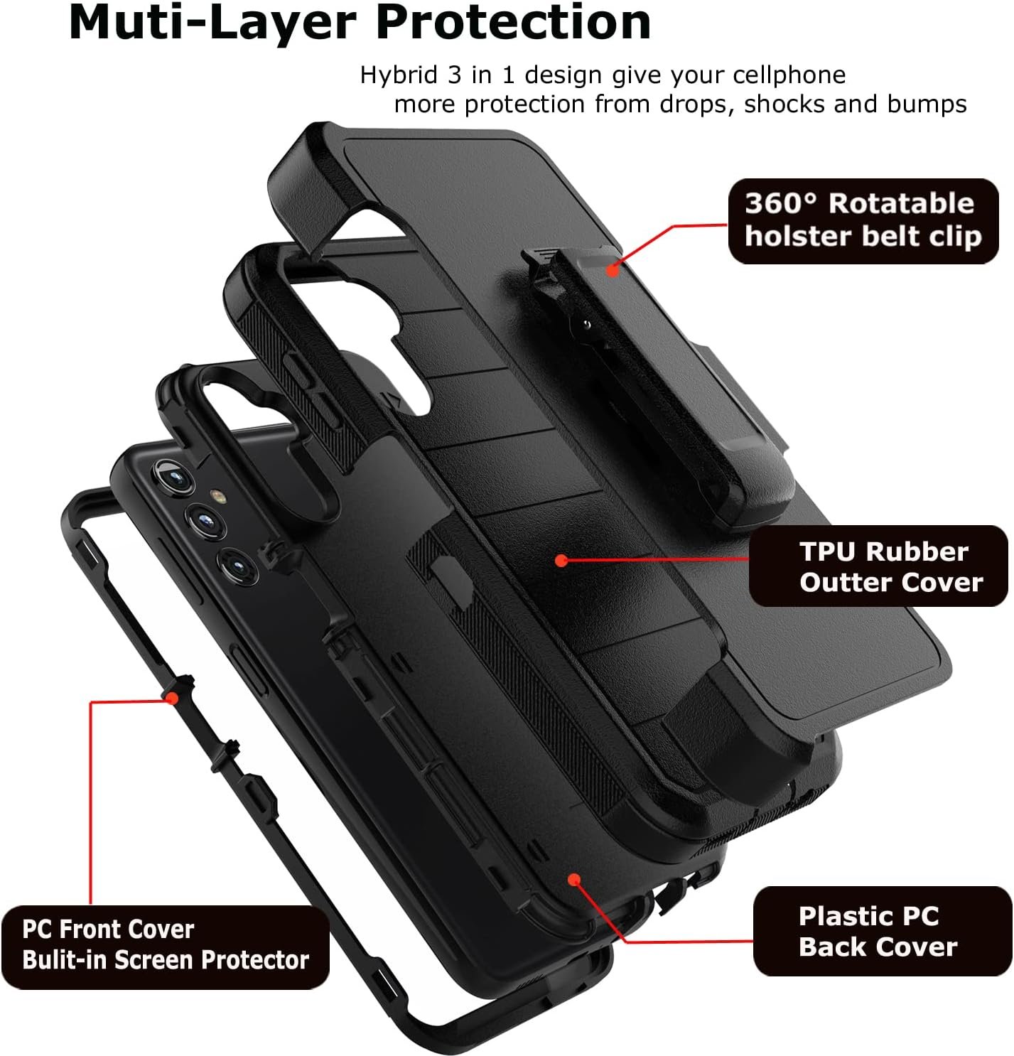 【Military Grade Protection】The Samsung A14 5G case with belt-clip holster offers full body protection with multi-layer design. Resilient TPU outer slip cover absorbs impacts. PC Inner hard shell deflects shock. Raised edge and four corners keep the screen and camera safe.