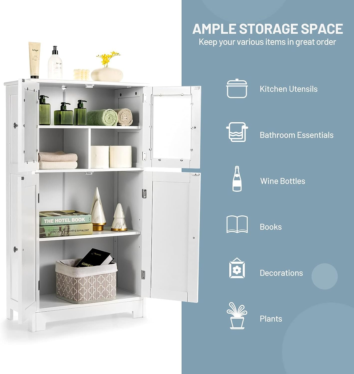 [Keep Your Home Neat & Tidy]: This floor cabinet provides ample space to store various items like bathroom supplies, aromatherapy, crafts, books, spice jar or other stuff, making them well organized. In addition, the lower inner shelf can be adjusted to 3 positions to provide flexible storage space for items with different heights.
