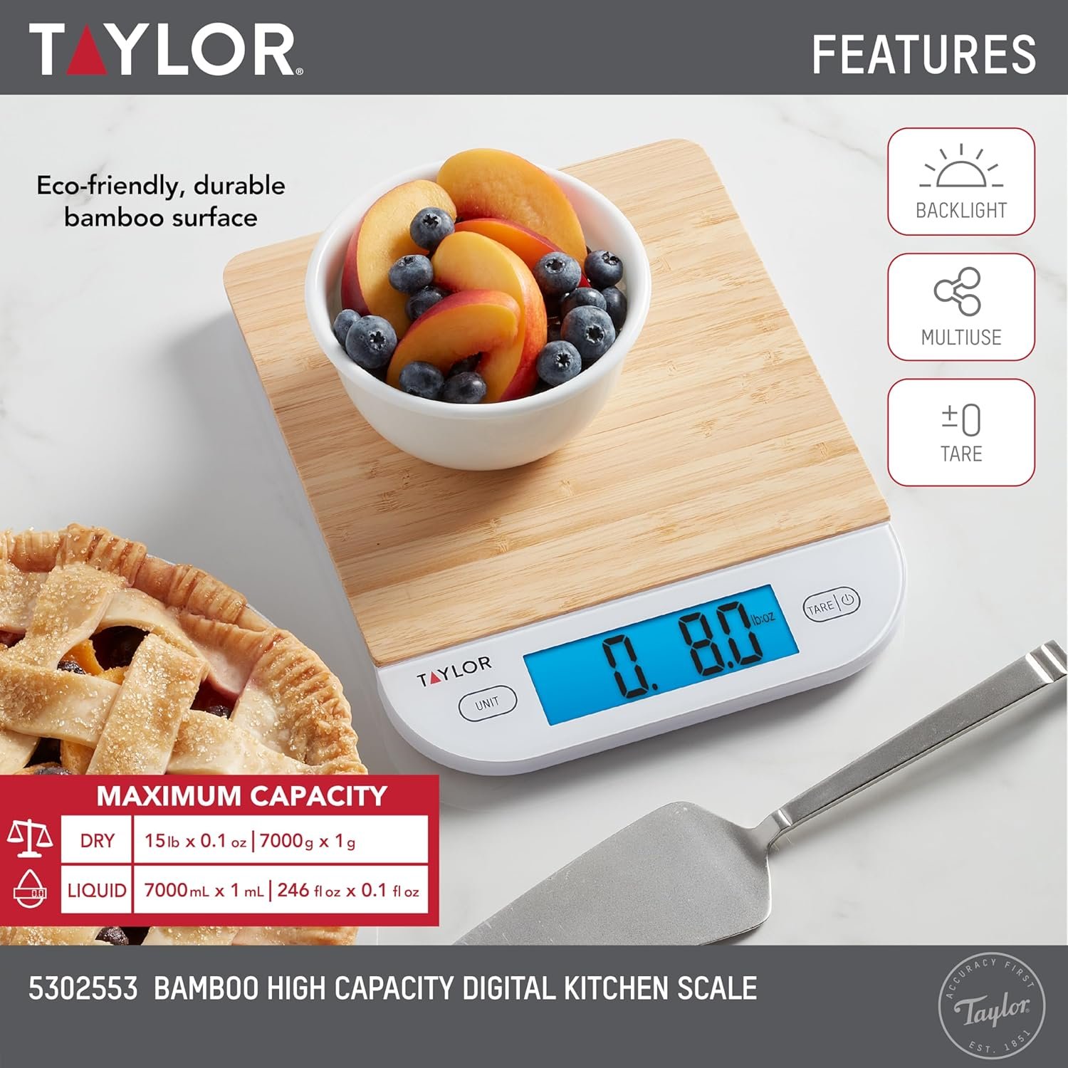 QUALITY AND PRECISION: This scale weighs up to 15lb (6.8kg) in 0.1oz (1g) increments and liquids up to 230fl oz (6800mL).
