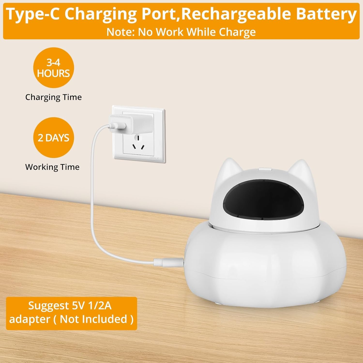 USB Rechargeable: Rechargeable cat toy fully charges about 3-4 hours, then work for 40hours, approximately 2 days of use or longer; Support any device with USB port charging, such as 5V 1-2Aadapter. Cat toys interactive can’t be worked while charging