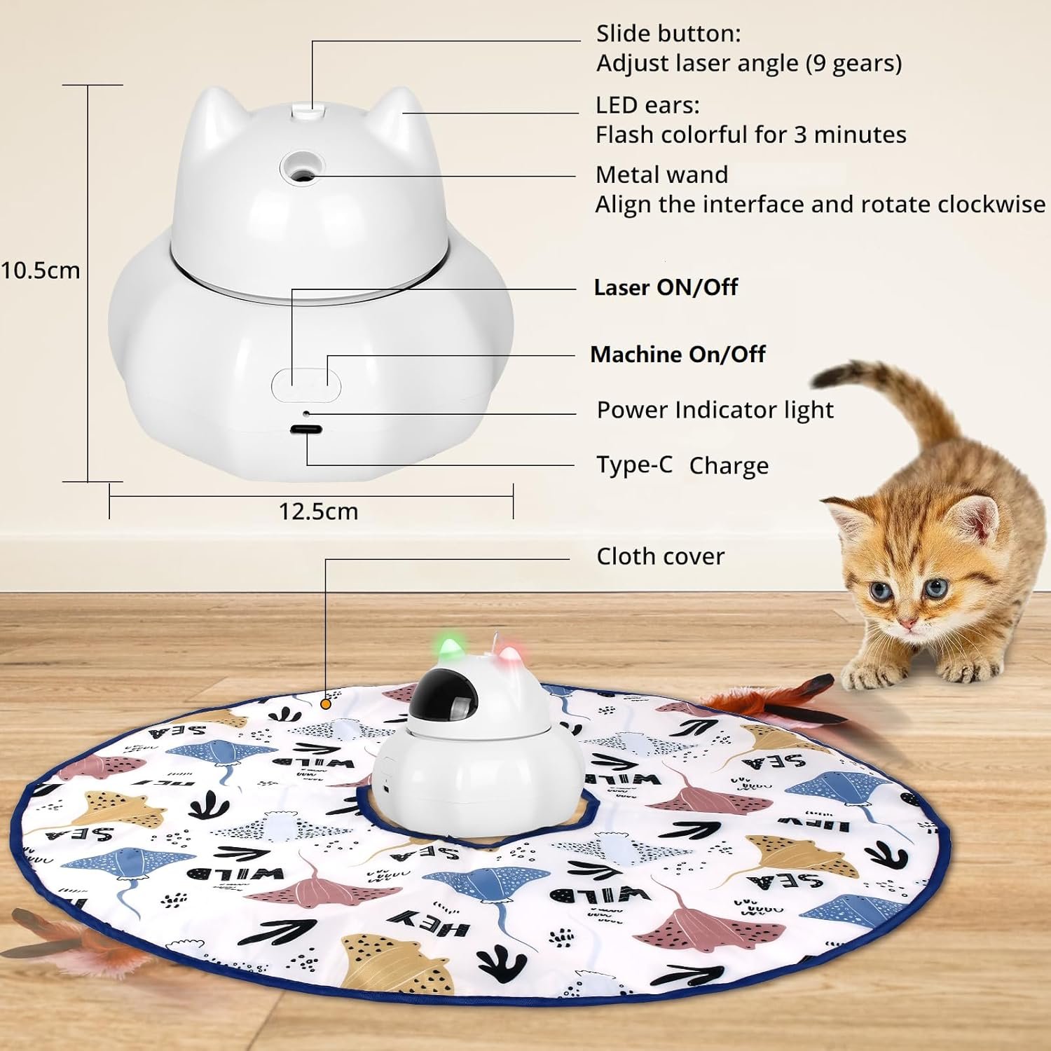 3-in-1 Interactive Cat Toys We can Choose: TBTeek’s cat toys combines three ways of entertainment; The red dot light moves as head rotates, with adjustable red light angles, can be turned off, to stimulates cats to chase and play; The 24inches feather wand rotate widely, and we can even hold feather wand toy in our hand as a cat wand; The short wand and cloth cover create some funny movements that will attract cats of liking hiding&seeking.