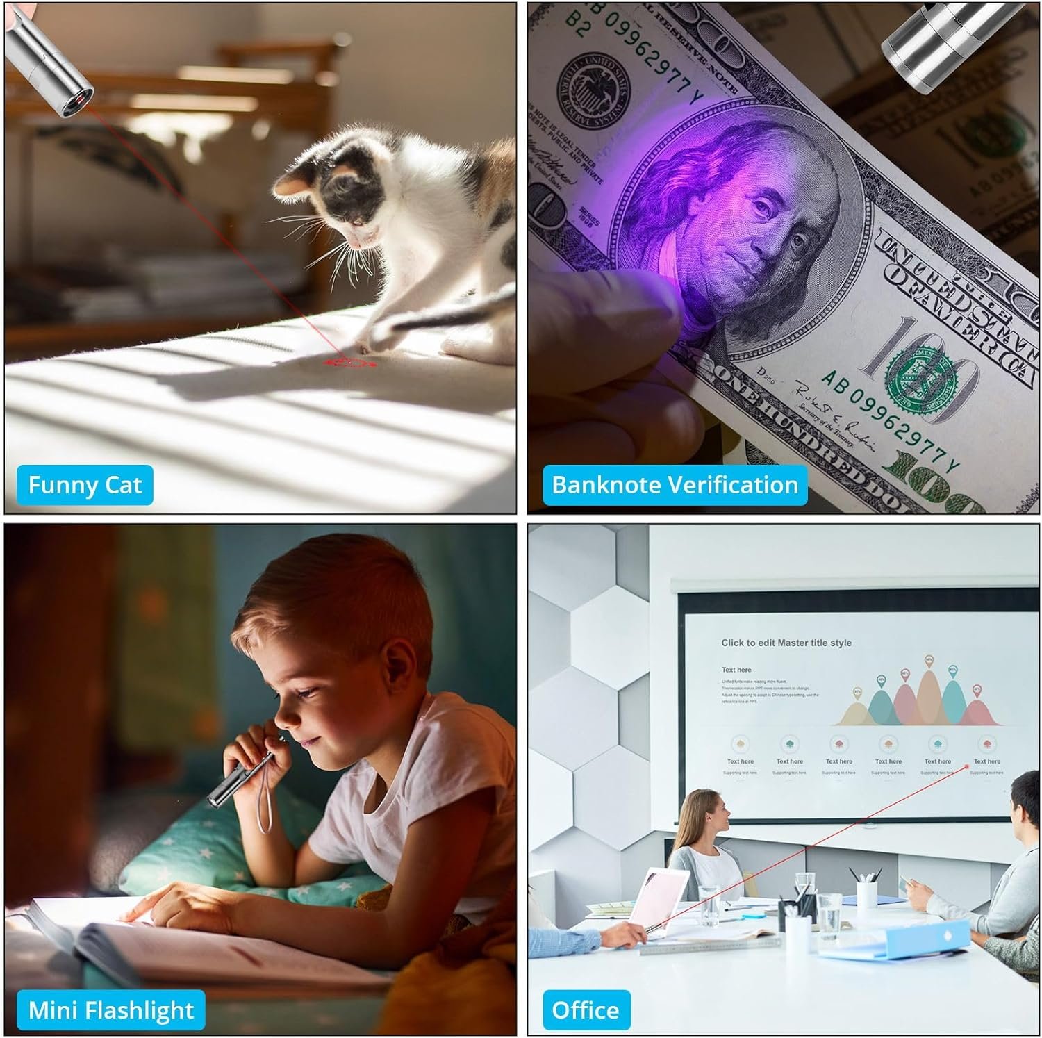 Multiple Function: Cat toy has three modes: red light, white light, and purple light, suitable for different situations. The red light is great for playing with your cat and convenient for clear PPT presentations.The white light flashlight helps light up dark corners to find your cat, and the purple light is useful for checking money and examining pets