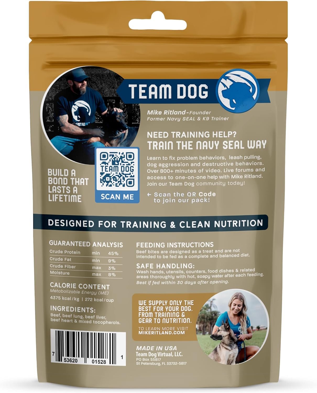 NUTRITION YOU CAN COUNT ON: Team Dog Premium Beef Bites All Natural Dog Treats are not only delicious but also contribute to clean nutrition, promoting overall health and vitality for your four-legged friend. Rich in protein and essential vitamins and minerals, our puppy treats for training offer a balance of flavor and nutrition