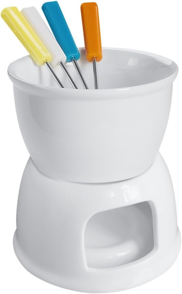 Made of ceramic earthenware with glossy glaze easy to clean and stain resistant, melted cheese or chocolate in a flash – no stove needed
