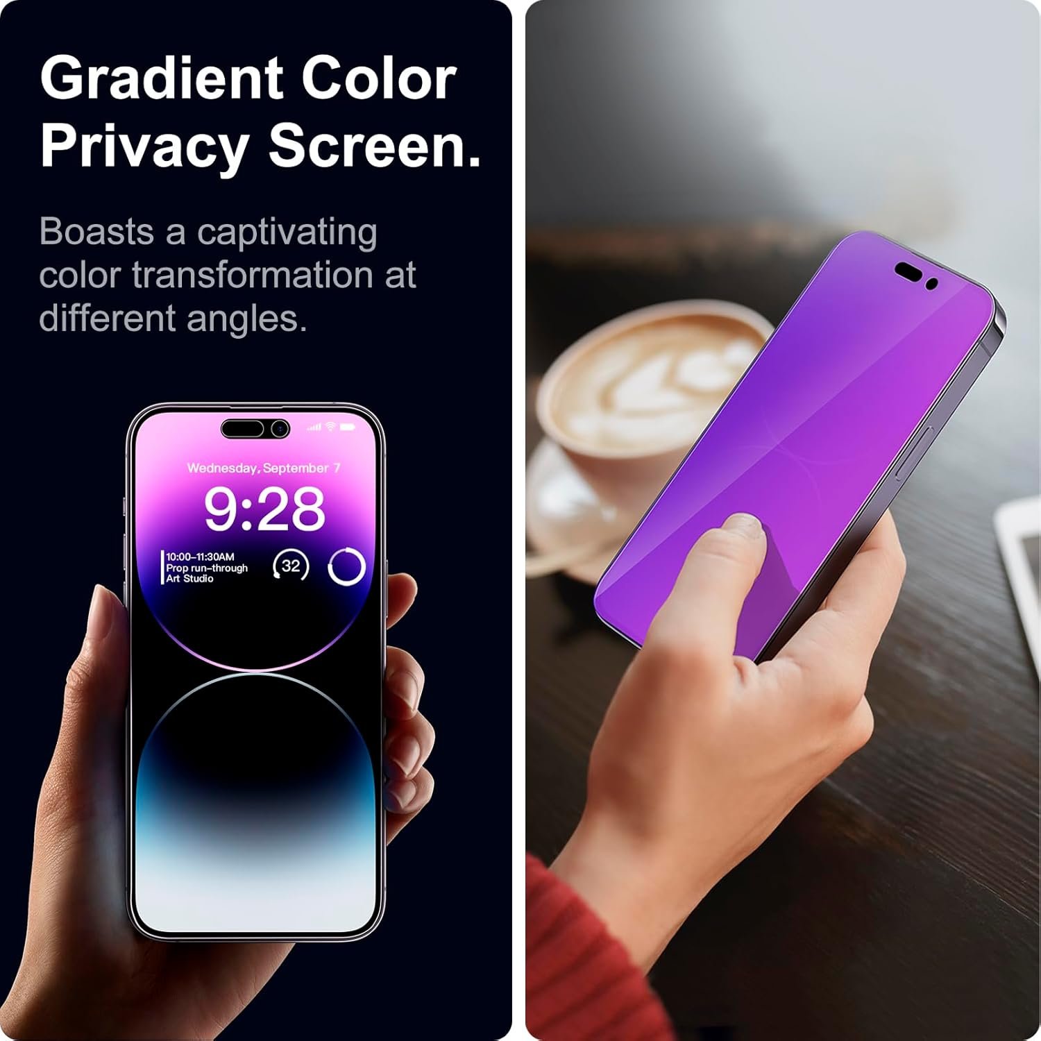 GRADIENT COLORFUL – Unlike typical black privacy screen protectors, ours boasts a gradient color from blue to purple at different angles. Watch as your phone comes alive with changeable, cool, and utterly unique shades. Experience the privacy protection like never before.