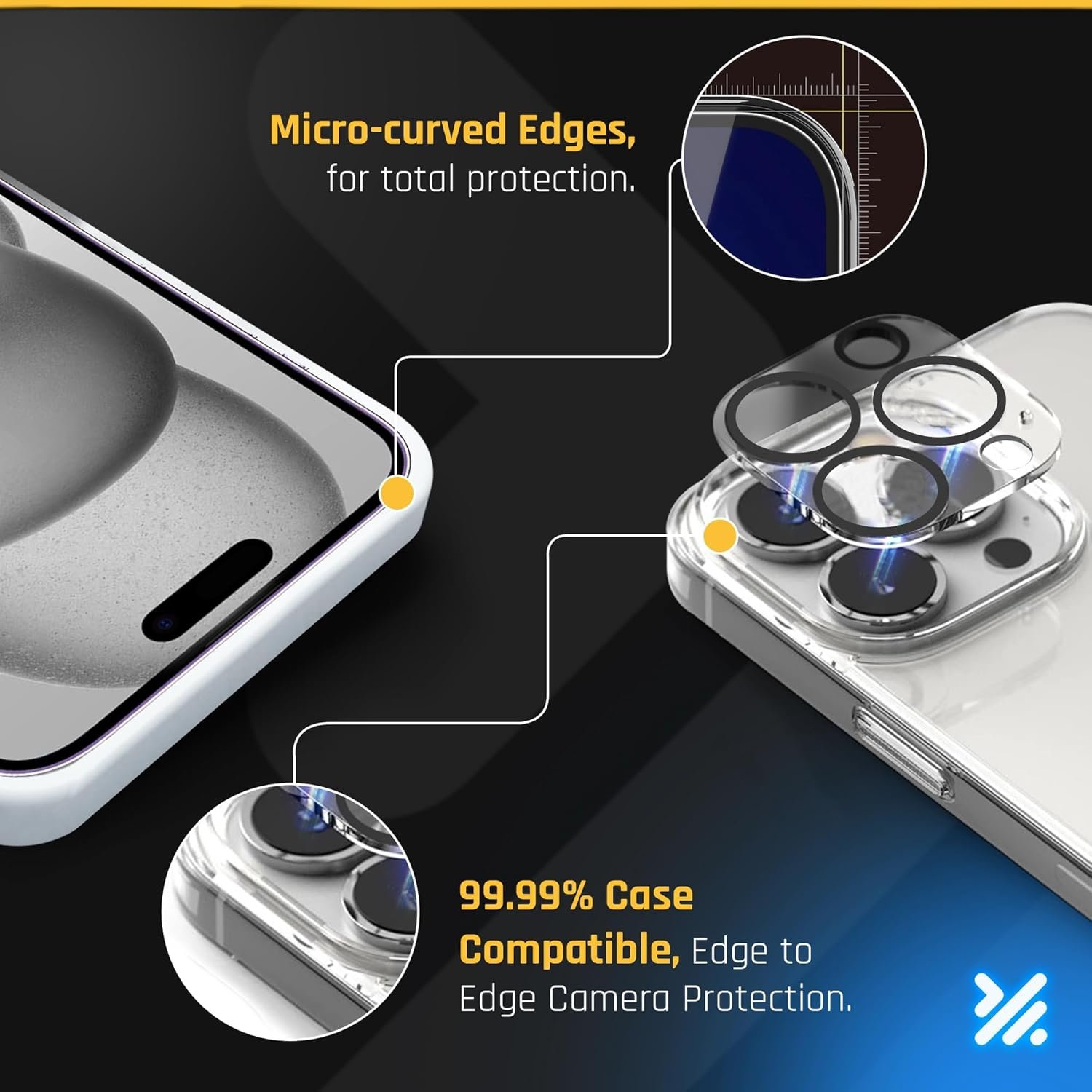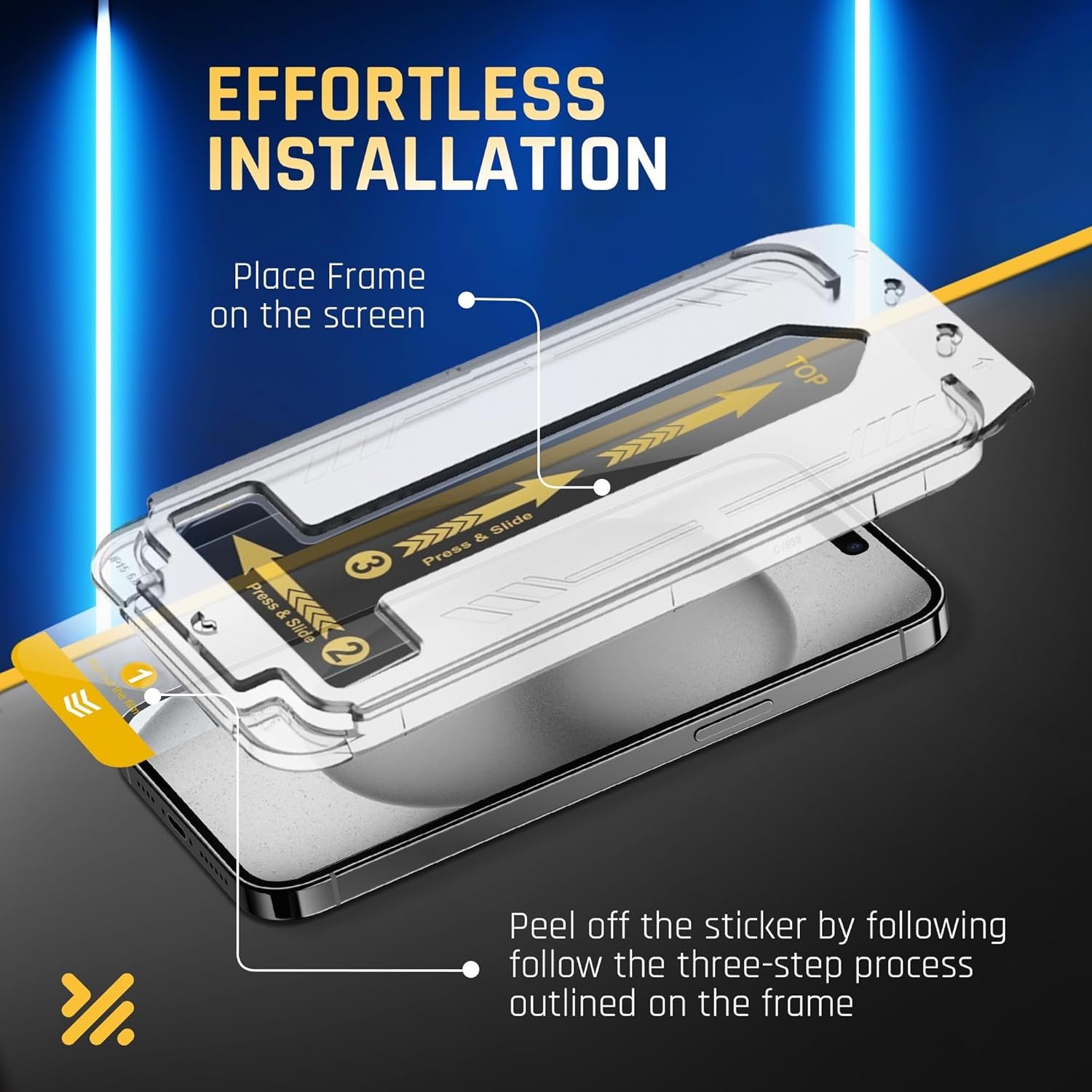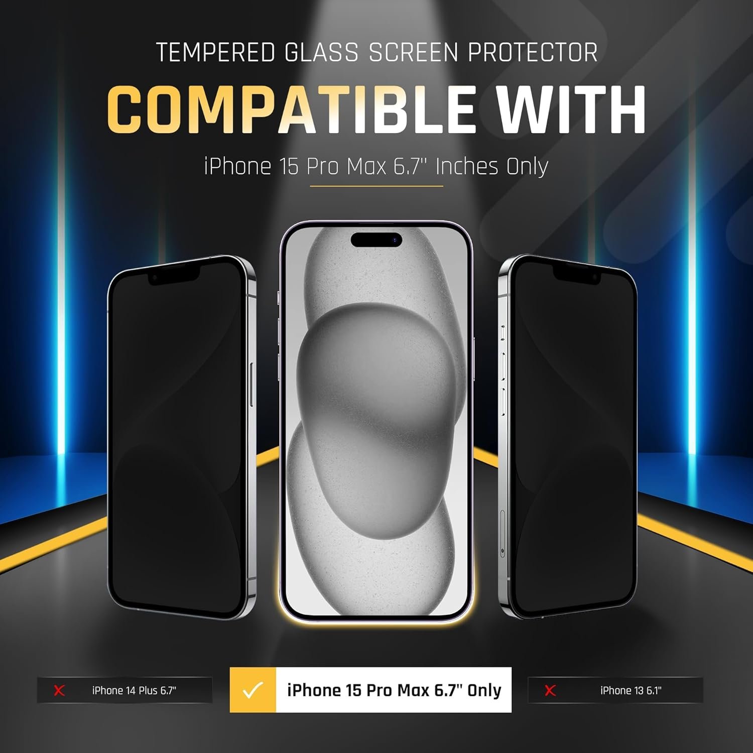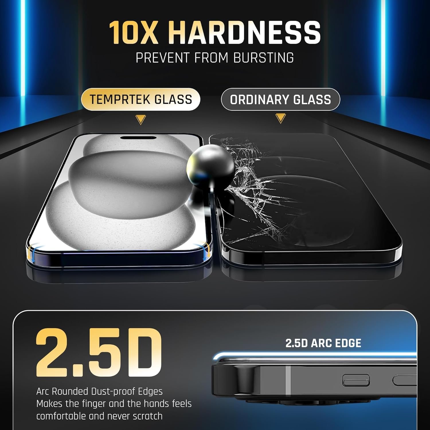 💪𝗧𝗘𝗠𝗣𝗘𝗥𝗘𝗗 𝗘𝗗𝗚𝗘 𝗣𝗥𝗢𝗧𝗘𝗖𝗧𝗜𝗢𝗡: Temprtek’s screen protector 15 pro max are engineered from robust 0.33mm premium tempered glass and feature elegantly curved 2.5D edges. These protectors have a sleek black border that fits flawlessly with your phone’s frame, warding off dust build-up and promising a snug, precise fit.