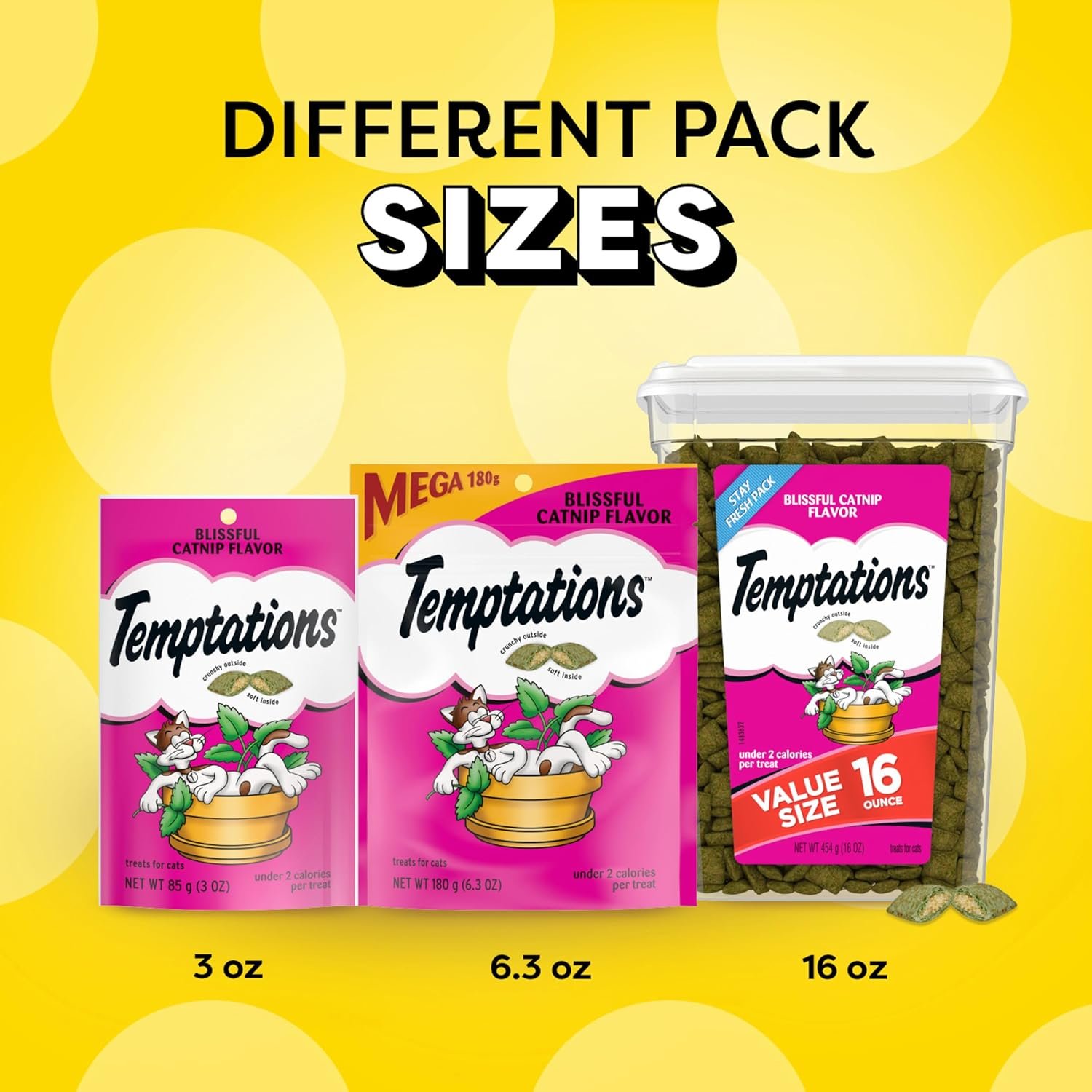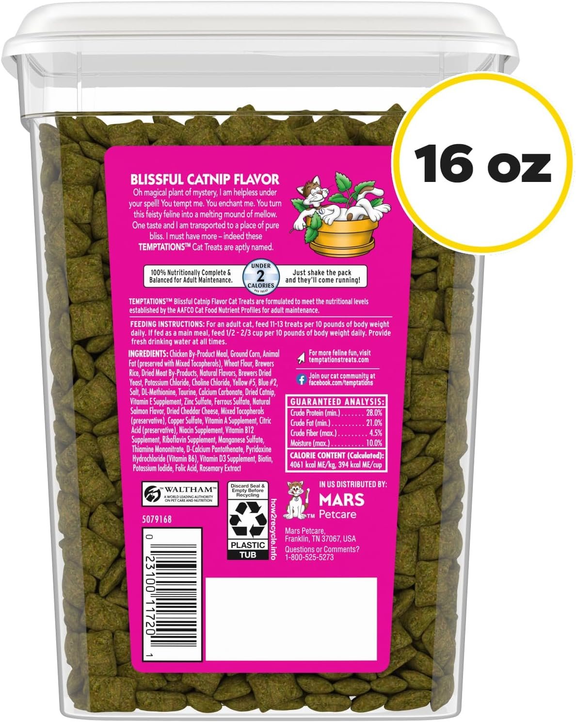 16 oz. Tub: Contains one (1) 16 oz. tub of Temptations Classic Cat Treats Blissful Catnip Flavor