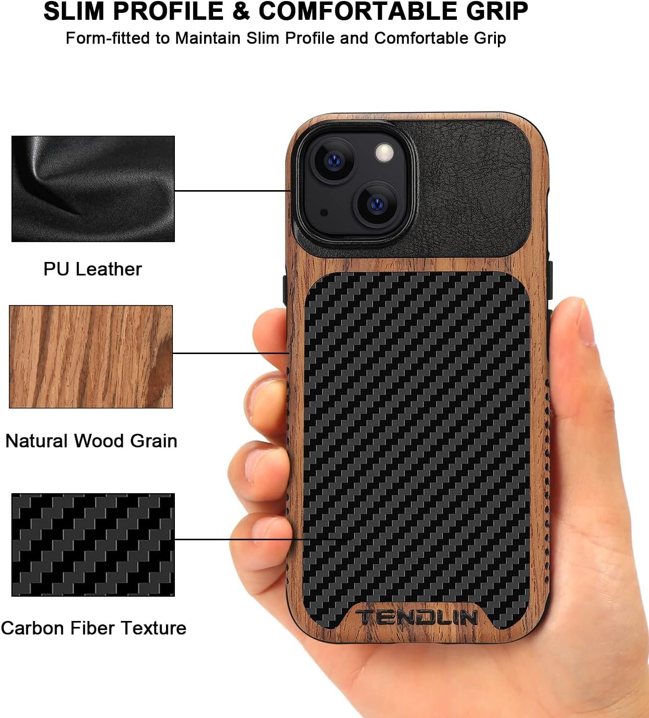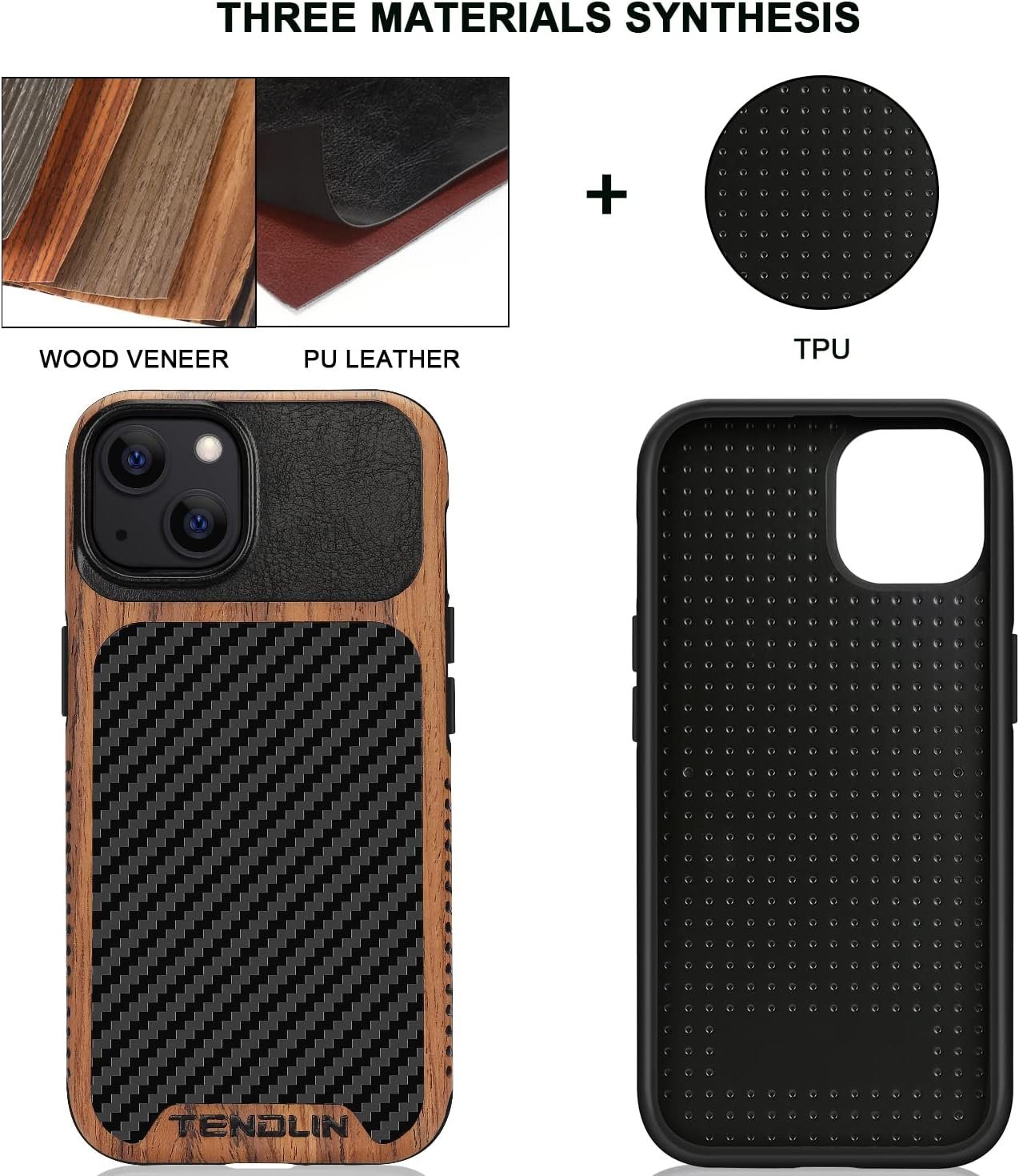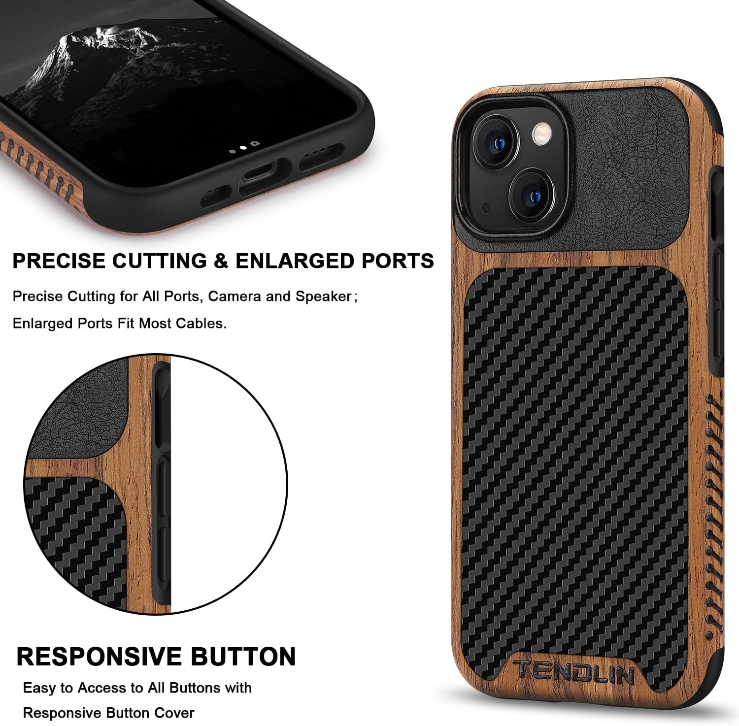 TENDLIN for iPhone 13 Case is made of natural wood veneer, PU leather and high quality Thermoplastic polyurethanes (TPU), three materials synthesis of one-piece case. Carbon fiber texture and real wood grain on the back offers good look and grip, that combine with shock absorbent TPU for reinforced toughness; Shock absorbent TPU inside provides protection against drops and shocks.