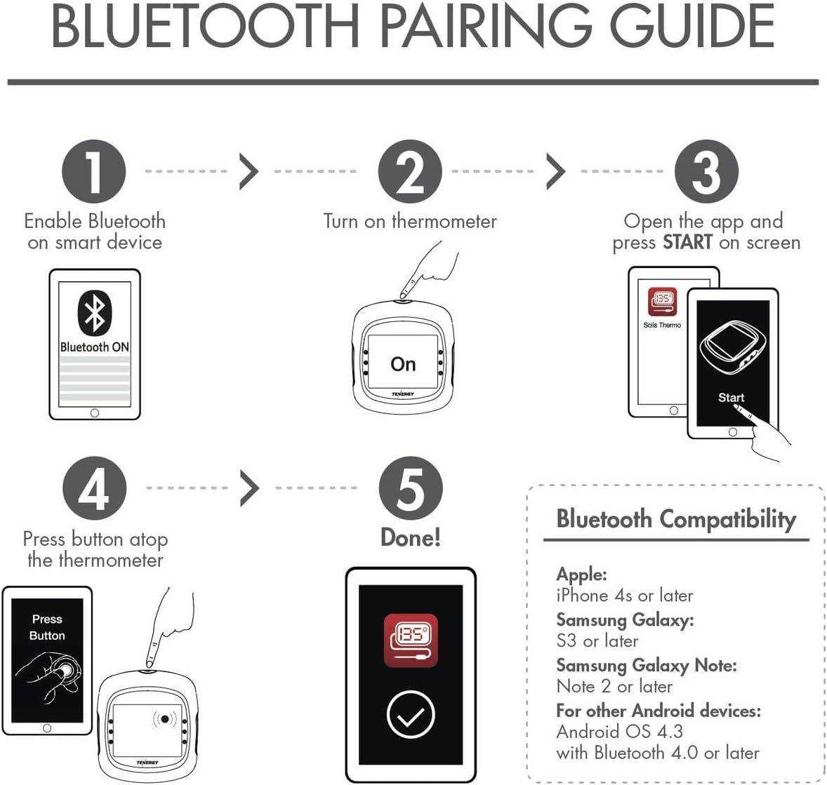Tenergy’s bluetooth thermometer also includes 2 Tenergy AA alkaline batteries for optimal performance.