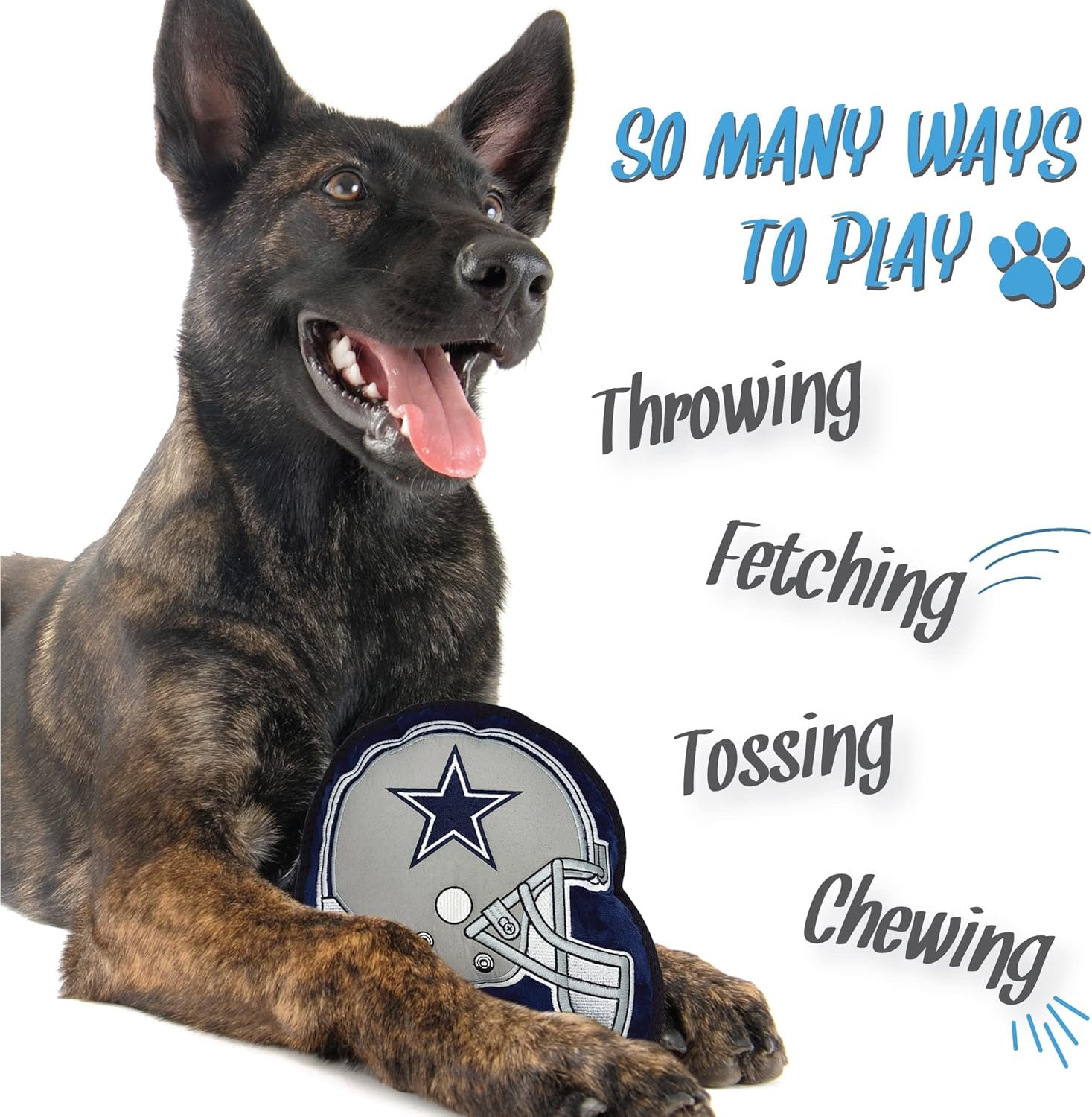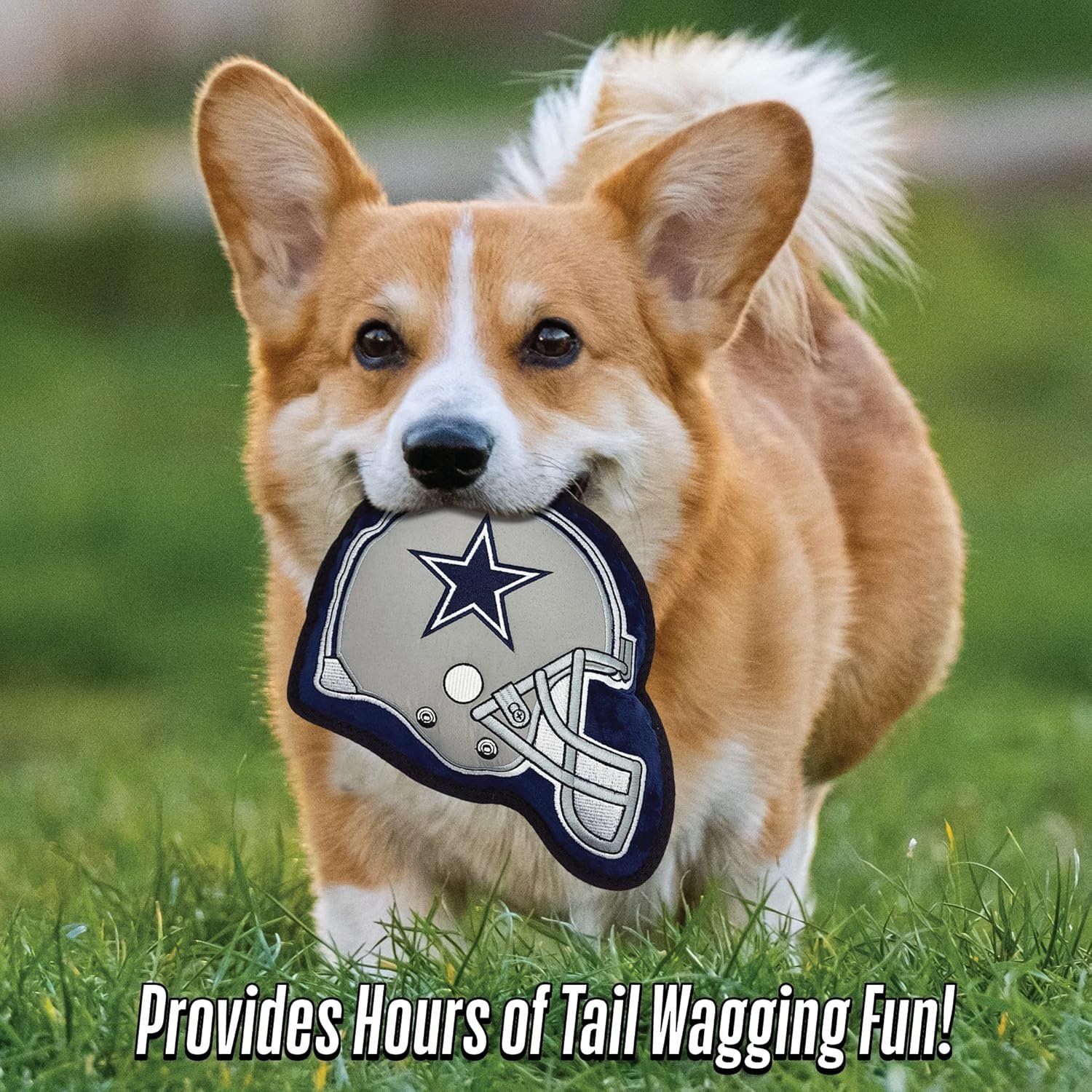 SQUEAKY DOG TOY – Dogs love to hear squeaky sounds as it releases a feel-good chemical called dopamine. Those happy feelings will encourage your furry friend to keep playing with its favorite squeaky toy and will help with reducing stress & anxiety. Our new NFL Tough Toy comes with a built in high quality squeaker to keep your pup entertained.