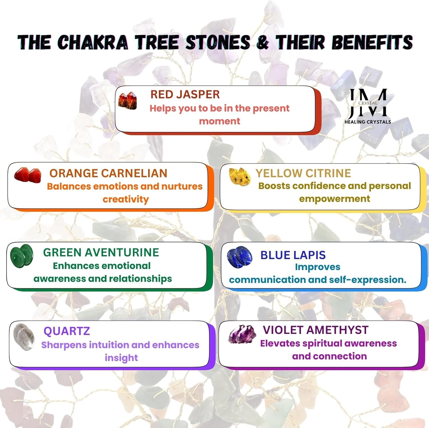 The 7 Chakra Crystal Tree promotes positive energy, emotional healing, mental clarity, and spiritual growth by aligning the Root, Sacral, Solar Plexus, Heart, Throat, Third Eye, and Crown chakras, fostering harmony, balance, and prosperity in life.