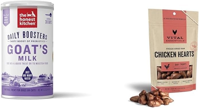 The Honest Kitchen Instant Goat’s Milk and Vital Essentials Chicken Hearts treats bundle offers wholesome nutrition for cats and dogs. The Honest Kitchen goat’s milk provides a highly digestible milk formula with 5 billion probiotics to support digestion, immunity, and wellbeing. It can be served alone or poured over food. Vital Essentials’ freeze-dried raw chicken hearts deliver premium protein from muscle, organs and bone marrow to provide energy, digestive health, clean teeth and gums. These complementary products both use human-grade ingredients free of artificial additives. The Honest Kitchen goat’s milk contains no preservatives or by-products, meeting FDA safety standards. Vital Essentials chicken hearts come from responsibly and humanely sourced chicken, frozen within 45 minutes of harvesting to lock in nutrients and flavor. Together these products offer natural nutrition to enrich your pet’s health and vitality.