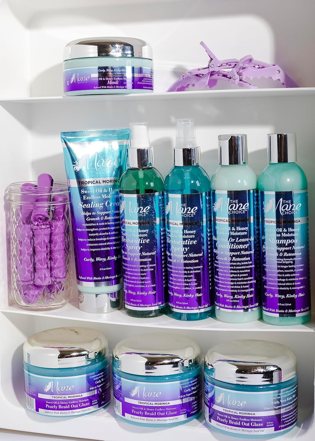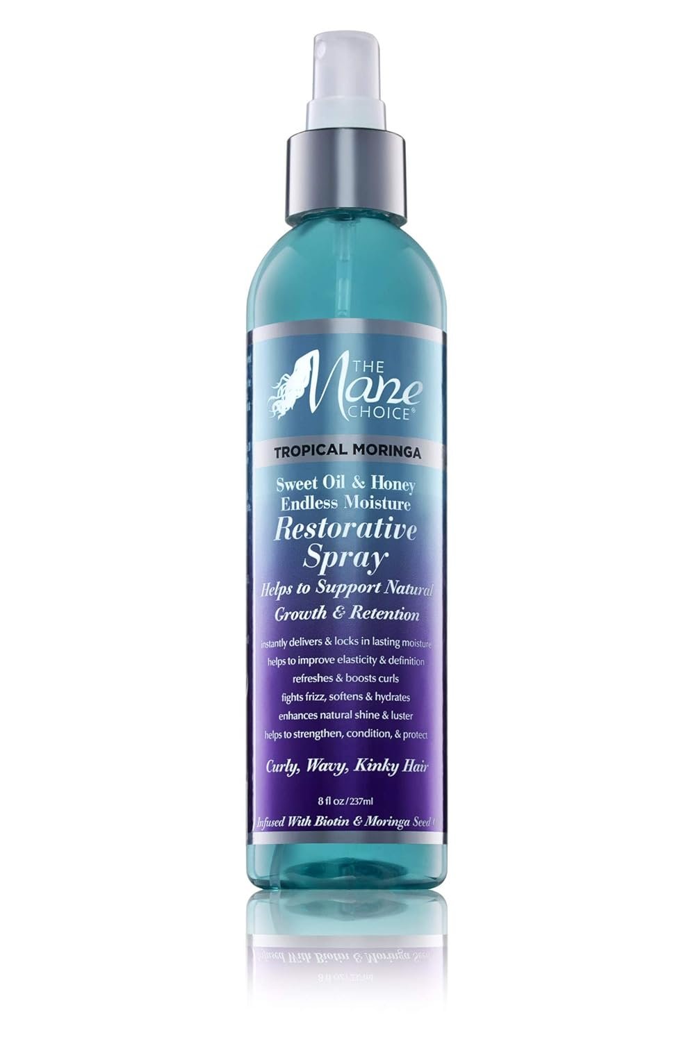 The Mane Choice Tropical Moringa Sweet Oil & Honey Endless Moisture Restorative Hair Spray Introducing The Mane Choice Tropical Moringa Sweet Oil & Honey Endless Moisture Restorative Spray, the ultimate solution for curly hair in need of hydration and revitalization. This innovative hair spray is designed to support natural hair growth and retention while instantly delivering and locking in lasting moisture. Formulated with the finest ingredients, this curly hair spray is free from mineral oil, petrolatum and parabens, ensuring that your hair receives only the best care. Infused with the nourishing benefits of Biotin and Moringa Seed Oil, it deeply conditions and protects your hair, leaving it feeling soft, hydrated and moisturized. Ideal for all hair types, this versatile hair refresher spray works wonders on all textures. The unique blend of ingredients refreshes and boosts curls, fights frizz, and enhances your natural shine & luster. Whether you’re looking to revitalize your curls on wash day or restyle your hair without water, The Mane Choice spray is the perfect solution. To restore your hair, simply spray the product evenly onto dry, previously styled hair. Use your fingers to distribute and reshape your curls back into place, enjoying the rejuvenating effects of moisture restoration. For daily styling, mist the spray lightly onto clean, damp hair before you begin your styling routine, providing your locks with a nourishing foundation. When it comes to hair care, The Mane Choice is a trusted brand. Commitment to quality is evident in their range of hair strengthening products, including this restorative spray. With The Mane Choice, experience the transformative power of a wide range of hair products, promoting hair growth, enhancing shine, and improving overall hair health. Invest in your hair supplies and embrace the beauty that comes with complete hair care and nourishment.