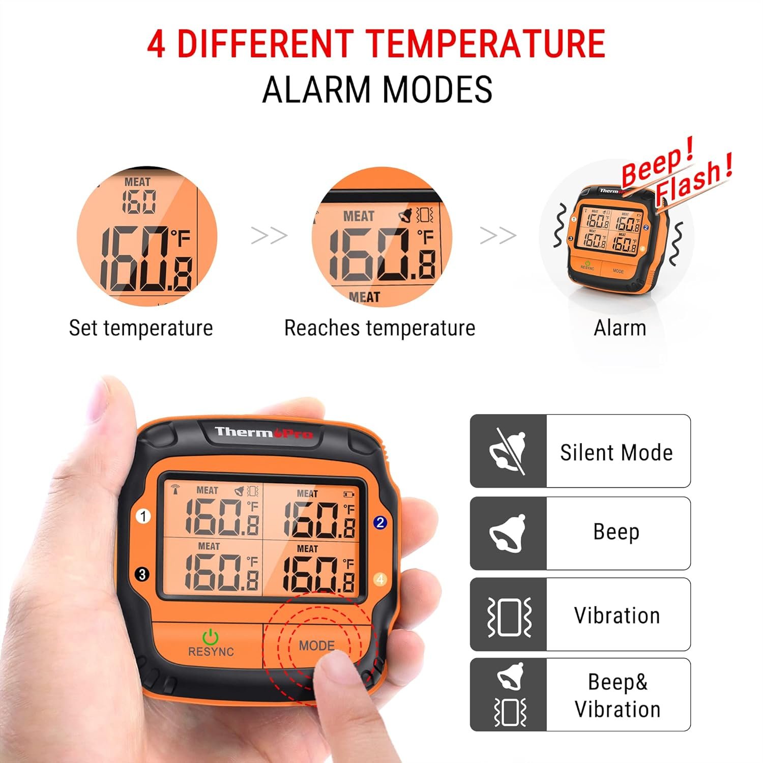 Smart Temperature Alarm: Grilling thermometer contains a unique alarm mode that will vibrate and flash on both the receiver and transmitter to inform you when the meat/bbq temperature reaches your setting; Never miss the perfect moment to take your meat off the heat