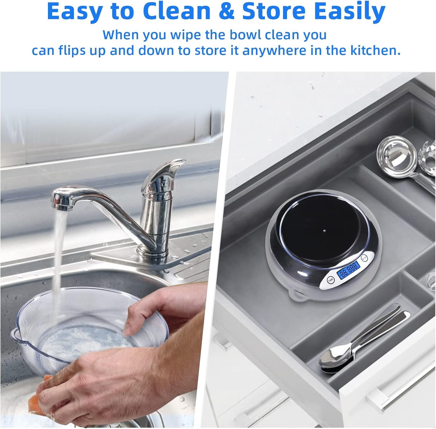 【Removable bowl & Compact design】The cooking scale offers a removable bowl with pouring spout and graduated scale, Which accurate measurement of water, milk and solid foods for free mixing and matching.It also flips up and down to save space and is easy to store.