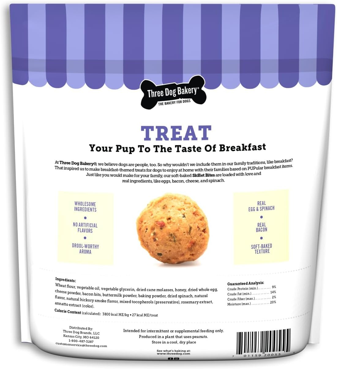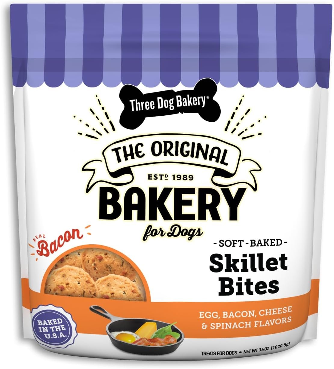 Three Dog Bakery Skillet Bites with Eggs, Bacon, Cheese, and Spinach, Soft-Baked Premium Dog Treats, 36 oz. Bag, Brown (320055)