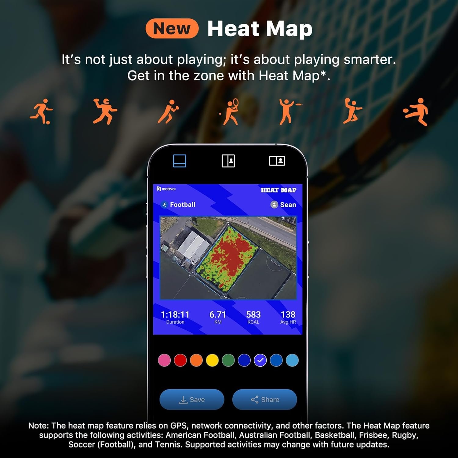 【New Function Heat Map】It’s not just about playing; it’s about playing smarter. Get in the zone with Heat Map*. Choose your favorite ball games, and let the watch track where you’re most active. See your strengths and opportunities at a glance. After the game, easily share your Heat Map to relive the highlights and strategize for your next win. Note: This feature relies on GPS, network connectivity, and other factors. The Heat Map feature supports the following activities: American Football, Australian Football, Basketball, Frisbee, Rugby, Soccer (Football), and Tennis. Supported activities may change with future updates.