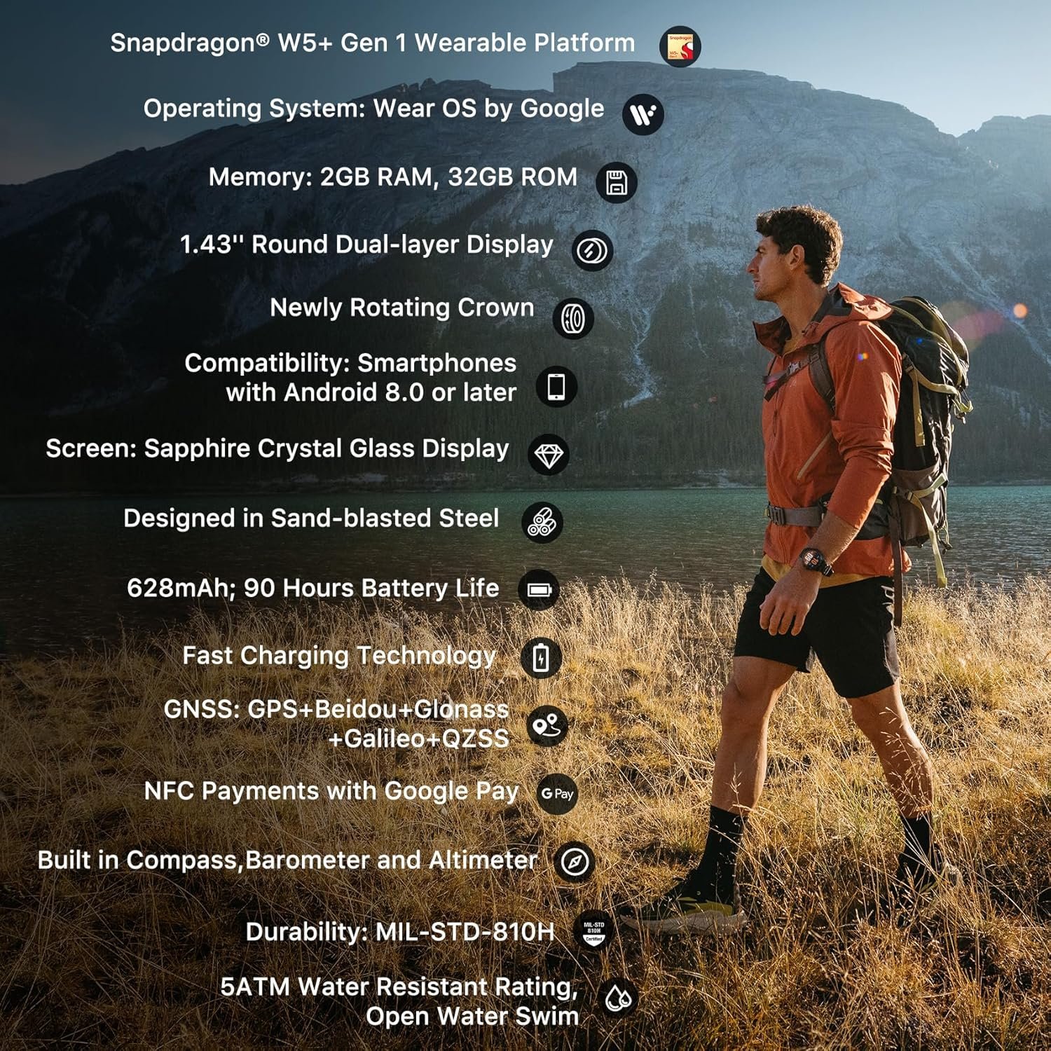 【Flagship Model, Upgraded Premium Design】Ticwatch Atlas smartwatch is made with beautifully sand-blasted steel for enhanced durability in any setting, and it is even US Military Standard 810H certified. Featuring a sleek and practical 1.43-inch OLED screen (466*466 high-resolution) with automatic brightness adjustment and Sapphire Crystal Glass. The interchangeable 24mm strap is crafted from durable and sweat-resistant fluororubber material. Personalize the dual display with vibrant backlight options and select from a wide variety of watch faces to complement your style and mood, with additional options available on Google Play.