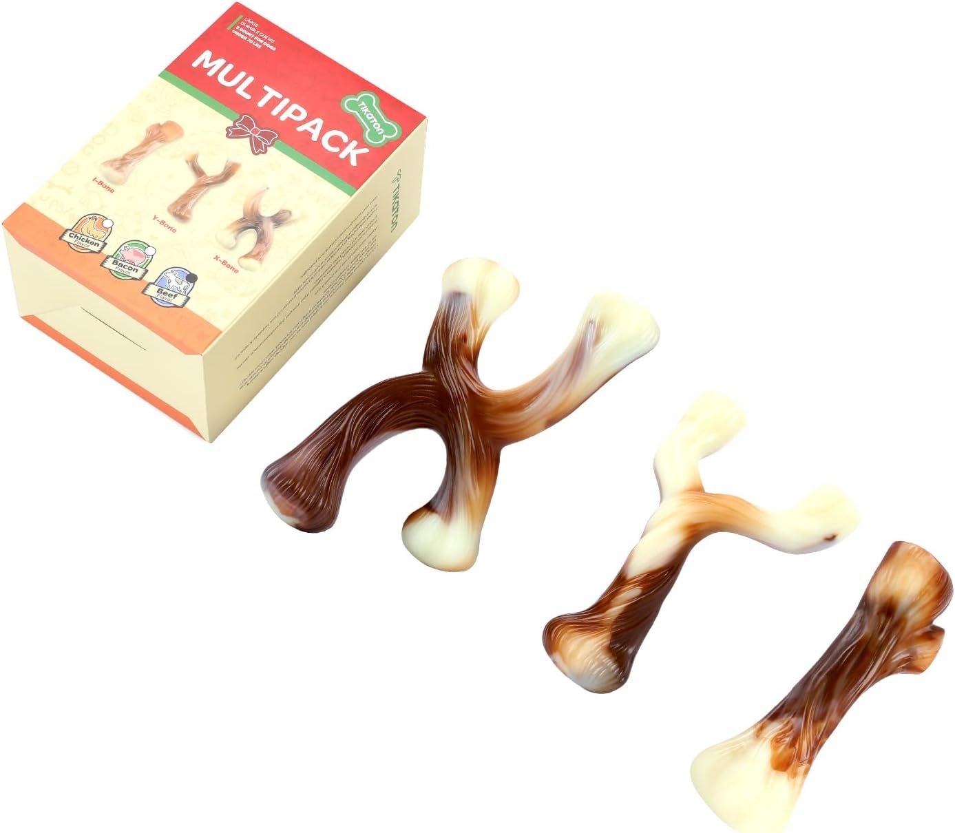 Three Fun Shape – The I-Bone shows the classic intereset of stick; the X-Bone is is easy for dogs to hold and chew; The Y-Bone allows your dog to chew from any angle.