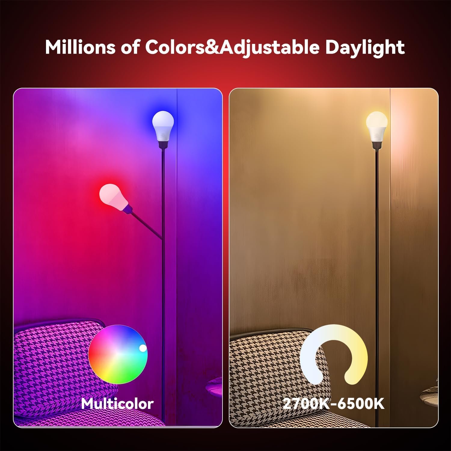 💡【Color Changing&Music Sync】Smart light bulbs have 16 million colors, You can adjust the color mode as you like in the different scene, color changing with the music sync. You can also choose the brightness of bulbs from 2700K to 6500K to your most comfortable luminosity.