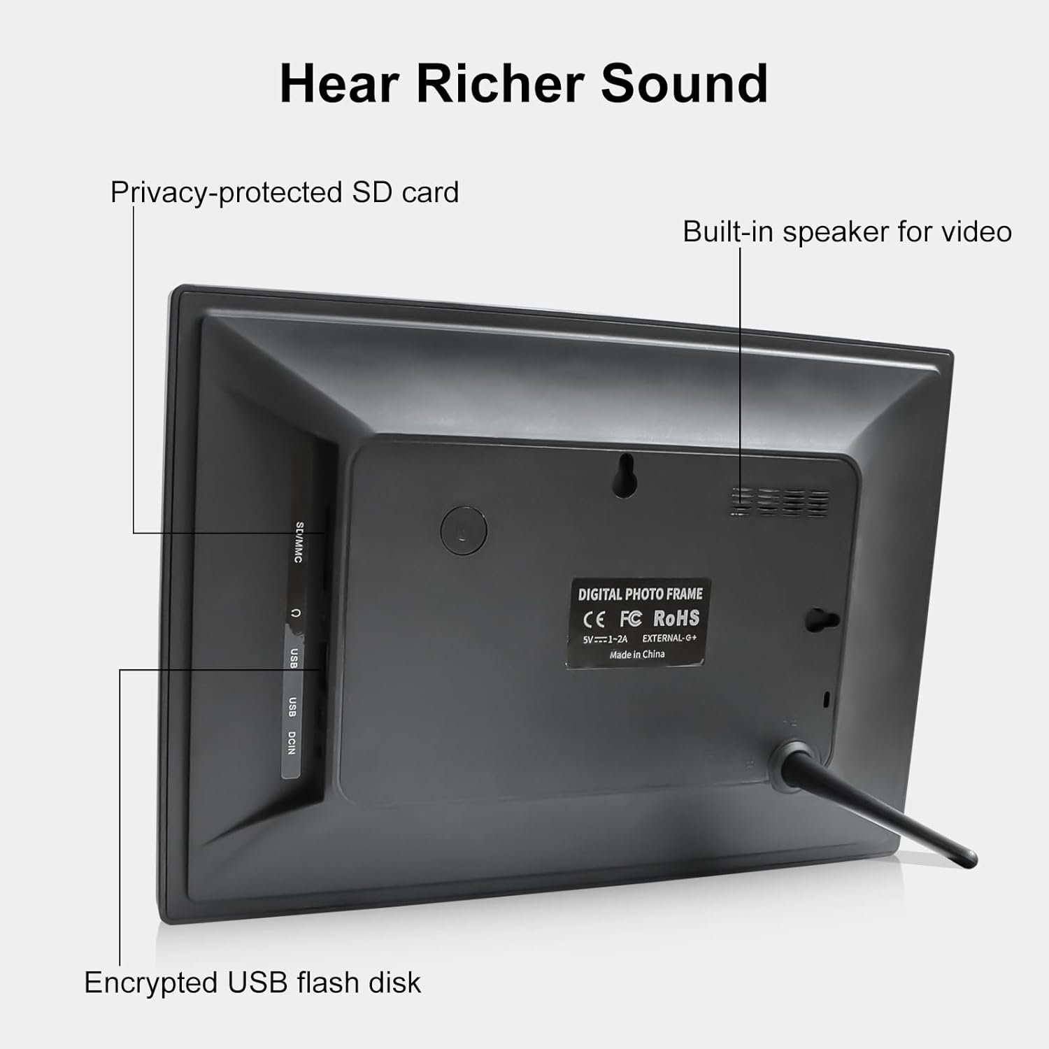 VIVID DISPLAY: TMC 10.1 inch digital picture frame features a 1280×800 FHD IPS touchscreen with a 1000:1 contrast ratio and 178° viewing angle. Picture frame electric digital supports JPG, JPEG, BMP, PNG images, and MP4 videos. (Note: SD card videos have no time limit; Uhale app allows 15 seconds.)