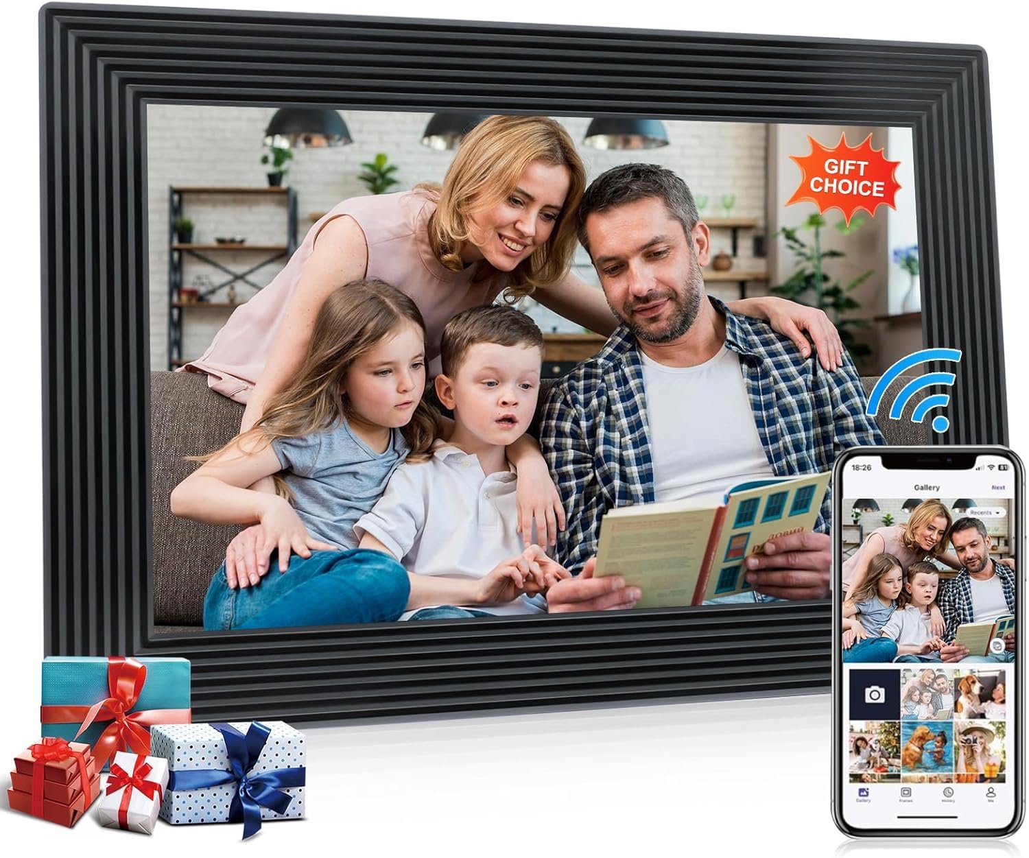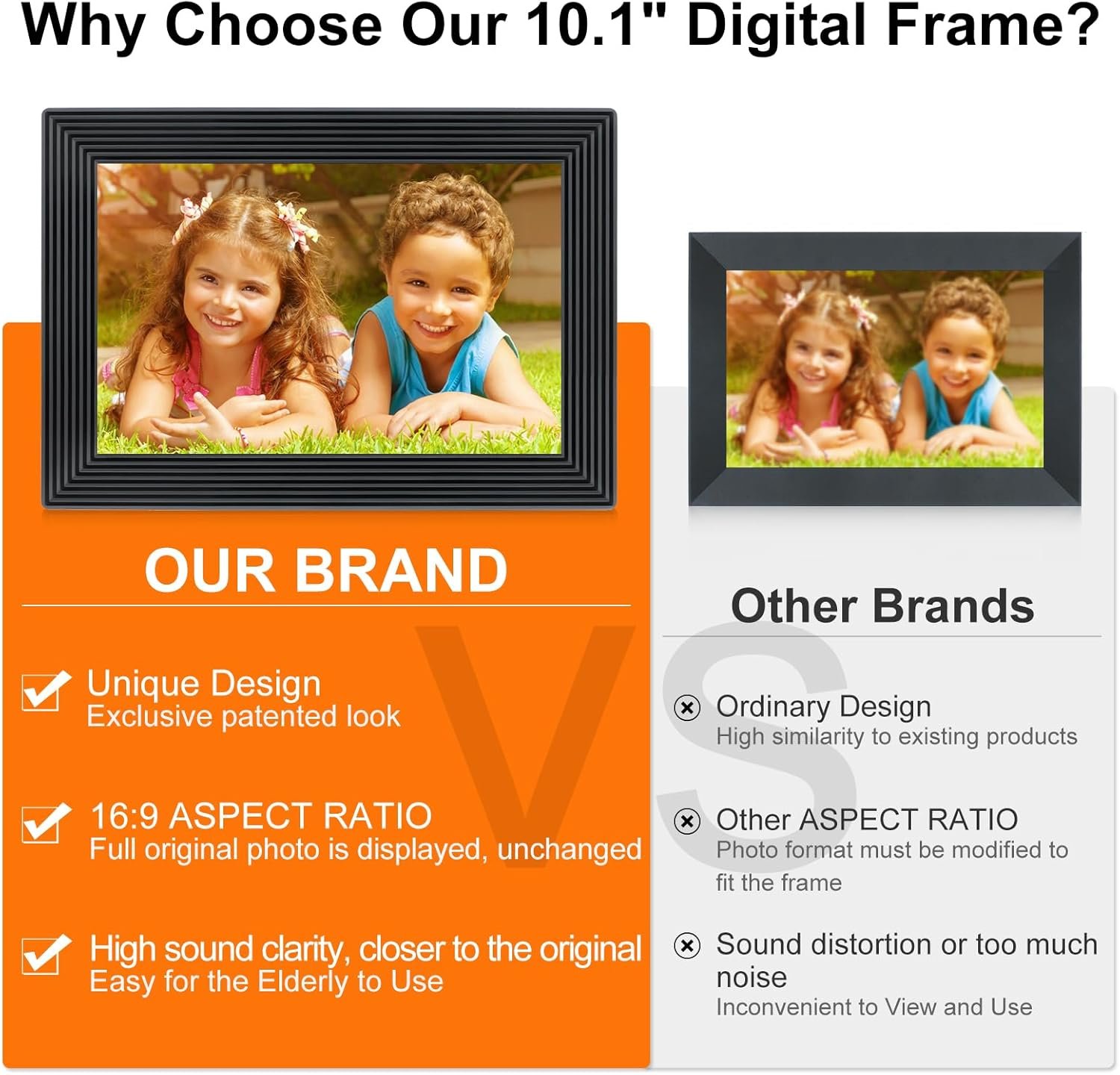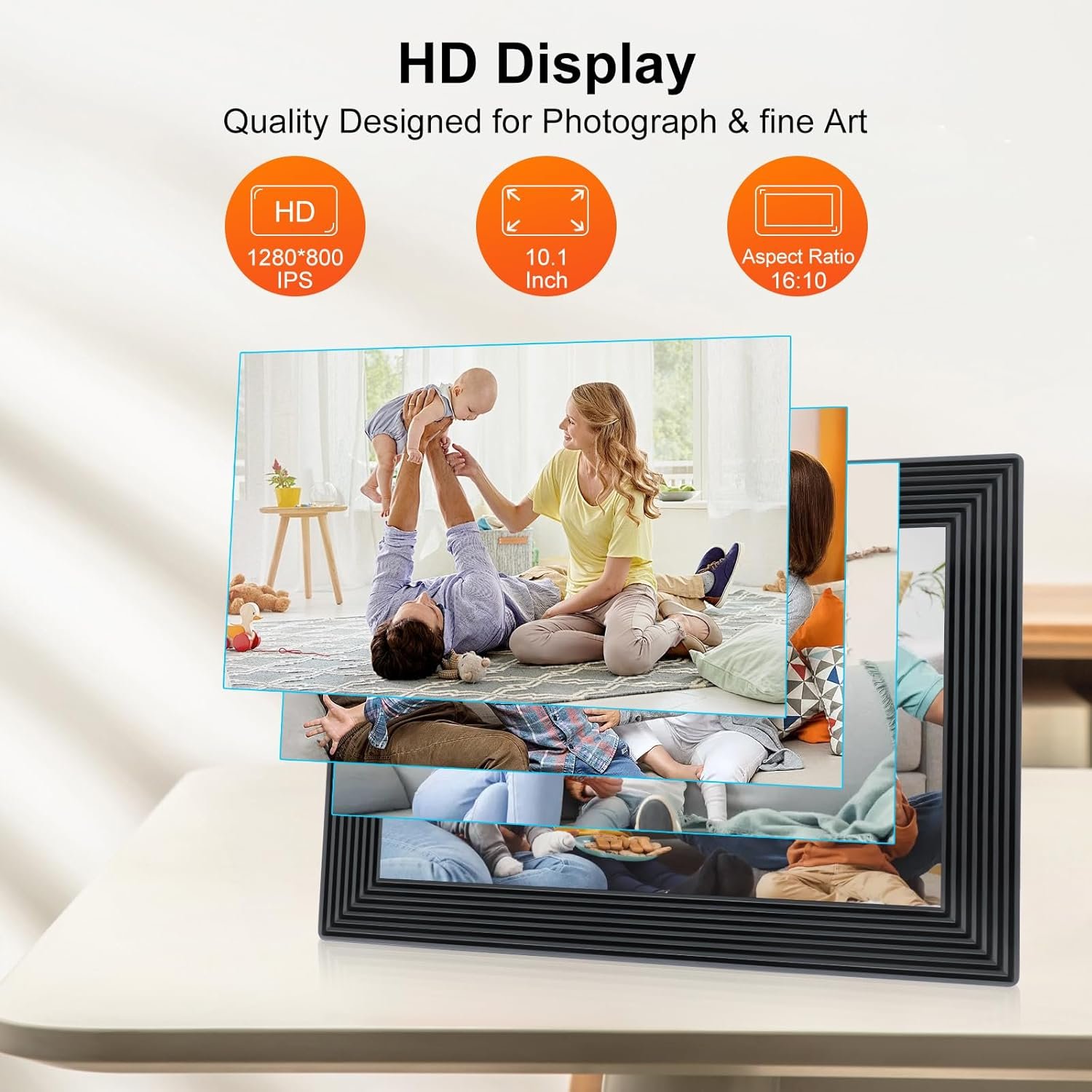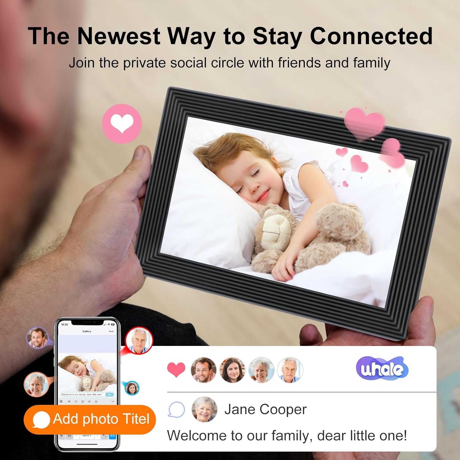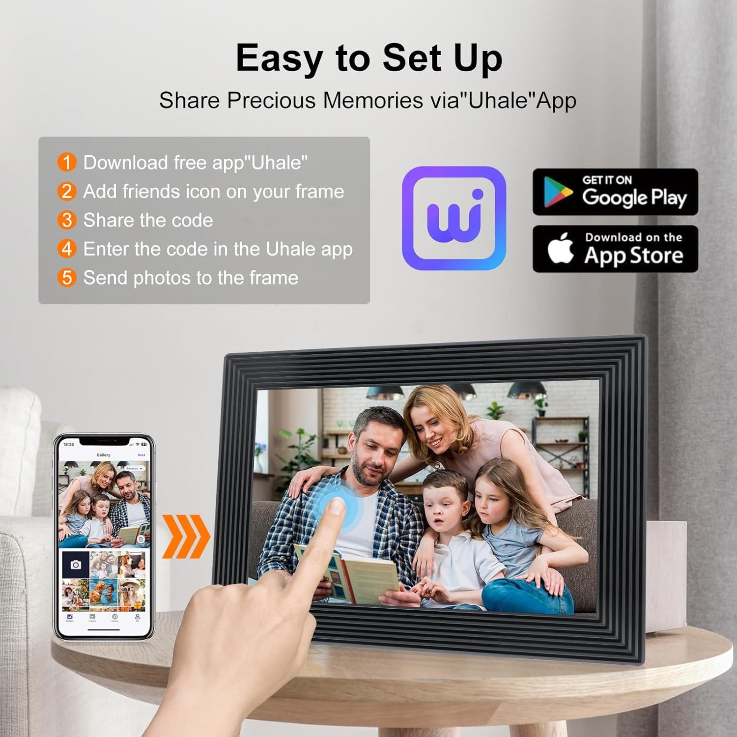WIFI SHARING SHARING: TMC digital picture frame is the simplest way to share photos with loved ones. Use the free uhale app to set up your 10.1 inch digital picture frame large in minutes over WiFi. Upload photos and videos instantly from your phone!