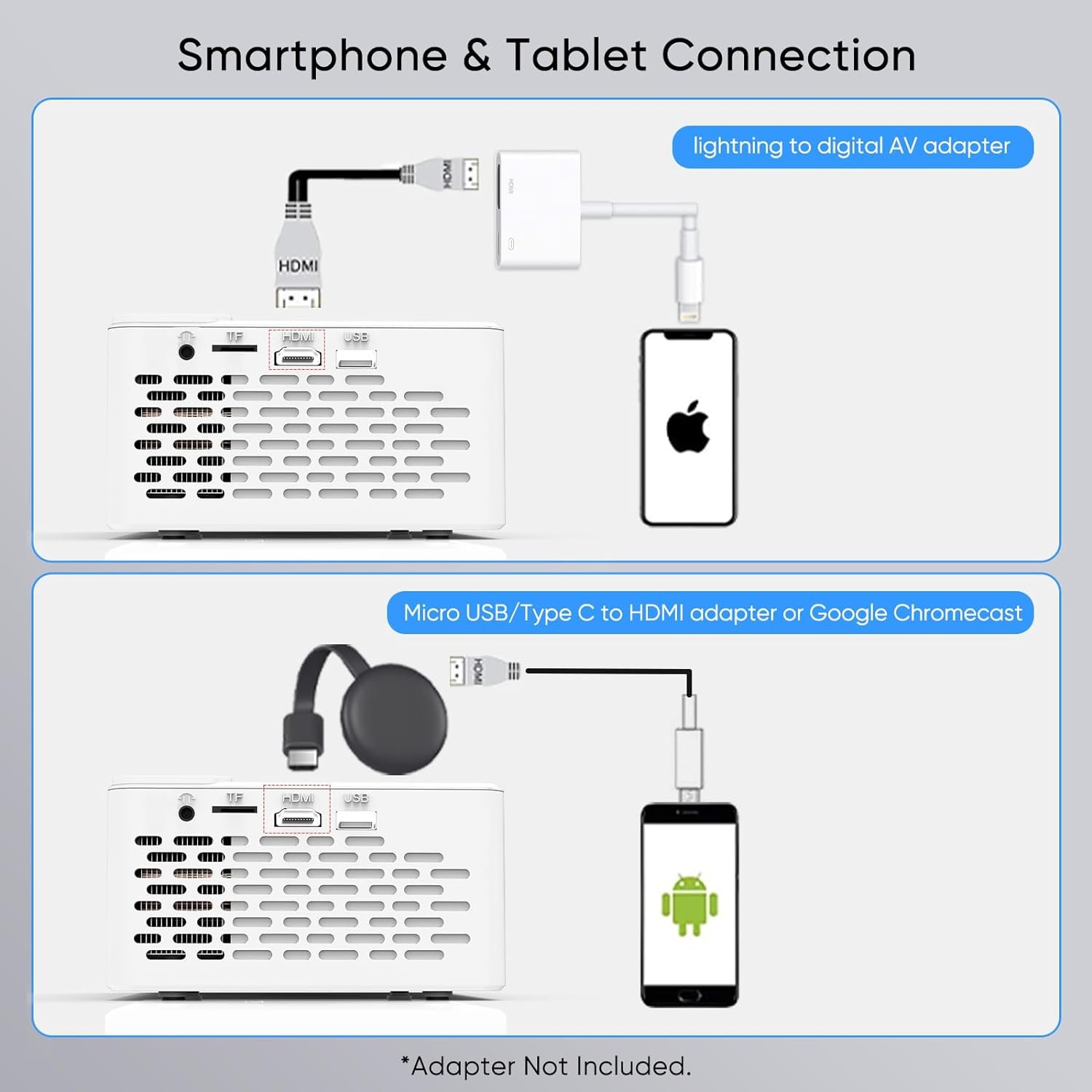 【Extensive Connection Availability】With the built-in HDMI, USB, 3.5mm headphone port & TF card slot, plus included HDMI cables, this portable projector is the perfect solution for a wide variety of input sources including but not limited to TV Stick/Box, Game Consoles, PCs, Smartphones, Tablets, Laptops, DVD players, TF cards and USB flash drives. Our V08 phone projector with screen is easy to use and provides a great value.