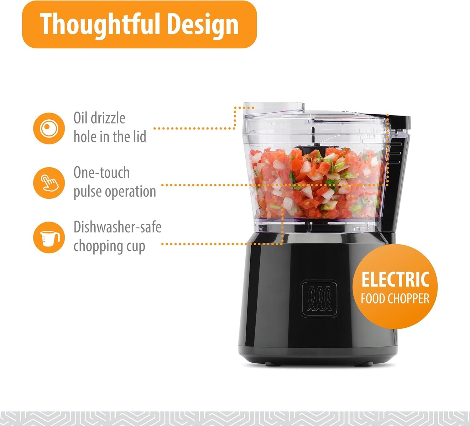 Electric Vegetable Chopper Features: This electric food chopper features one-touch pulse operation and an oil drizzle hole in the lid; it’s perfect for making salsa, dips, sauces and more