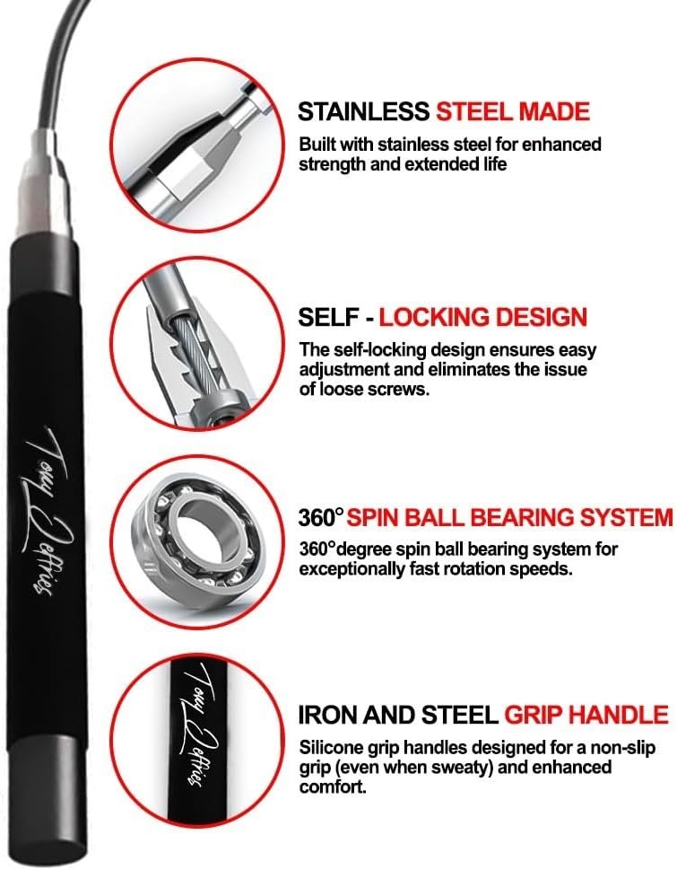 Unique designSpeed Rope precision Used by Tony Jeffries Spinning soft grip handles Easy adjustable length