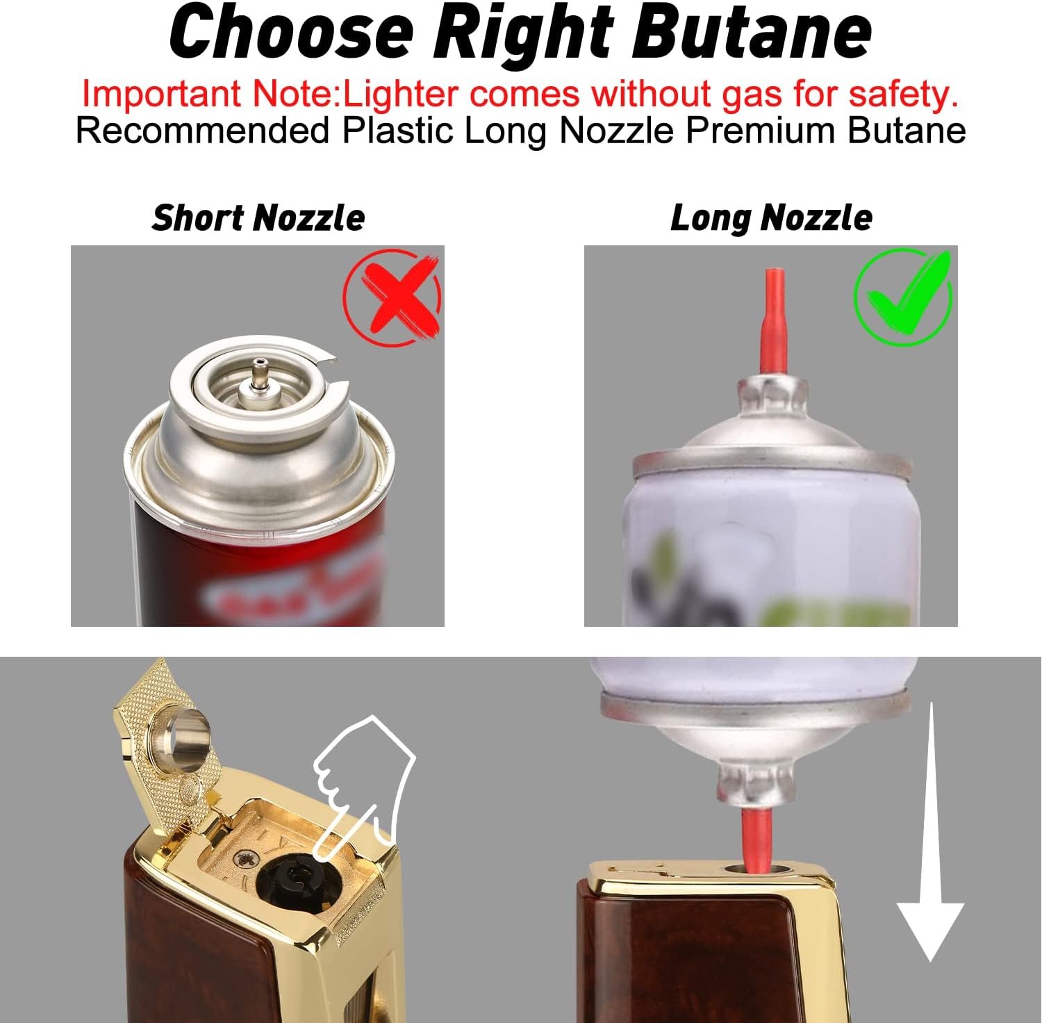 【ADJUSTABLE FLAME】This refillable butane torch lighter has an adjustment wheel at the bottom, you can rotate the adjustment wheel to adjust the flame height. If the valve is too large or too small, it is not conducive to igniting the flame. If you fill the lighter with butane and the ignition fails, you can try to adjust the valve to find a suitable ignition point, and then the lighter will work normally.