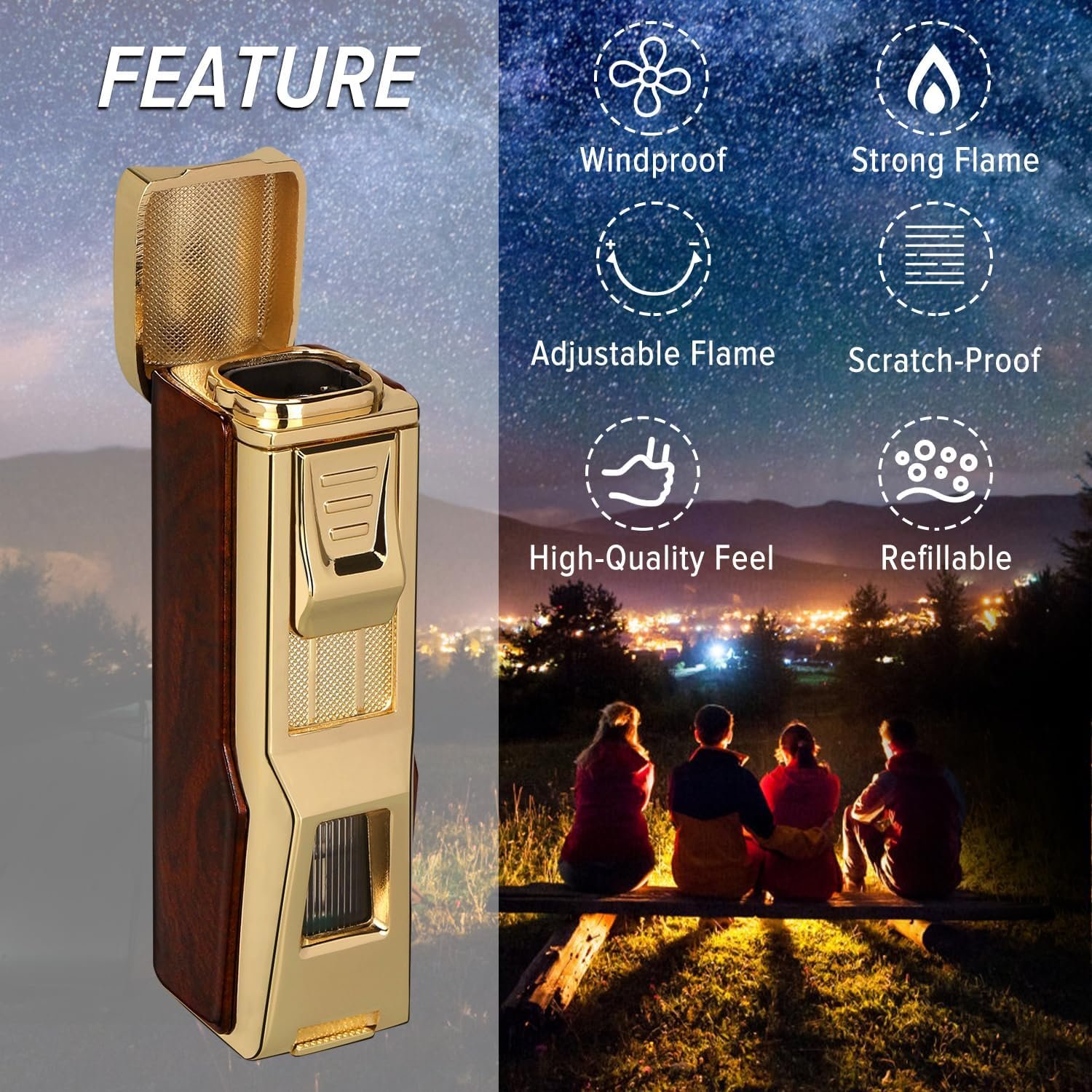 【HIGH-QUALITY MATERIALS】The refillable butane lighter is made of premium alloy material, drawing craftr, plus electroplating polishing, all these procedure make this torch lighter sturdy, wear-resistant and high-temperature resistant.