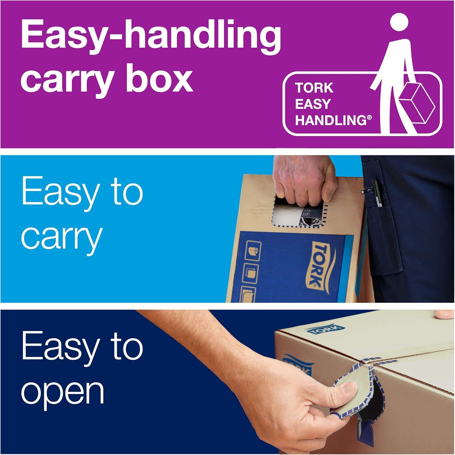 Make maintenance easier on staff with our Tork Easy Handling packaging, which is easy to open, transport and dispose of.
