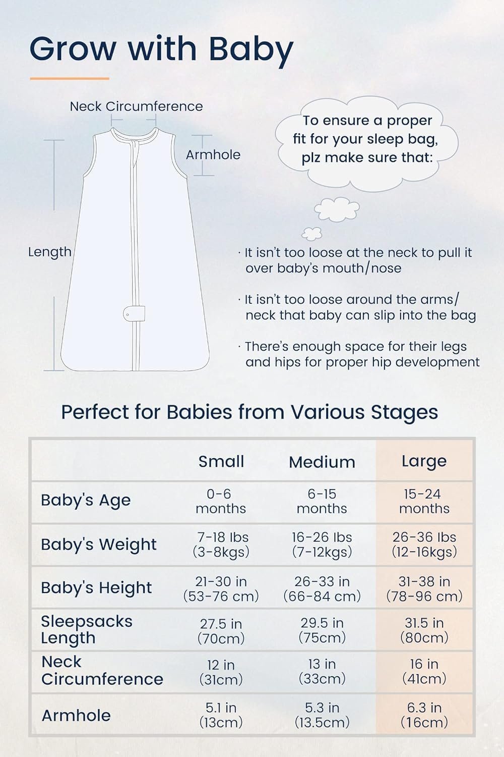 To ensure a proper fit for TotAha BABY sleep bag, plz make sure that: