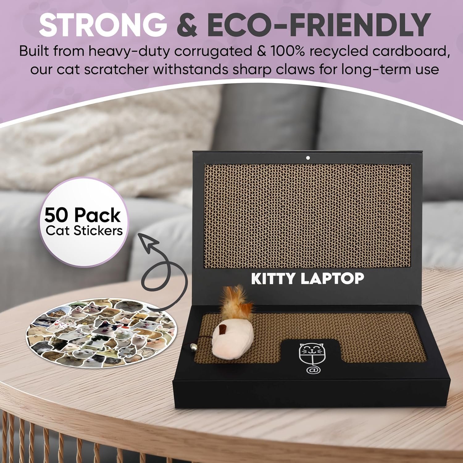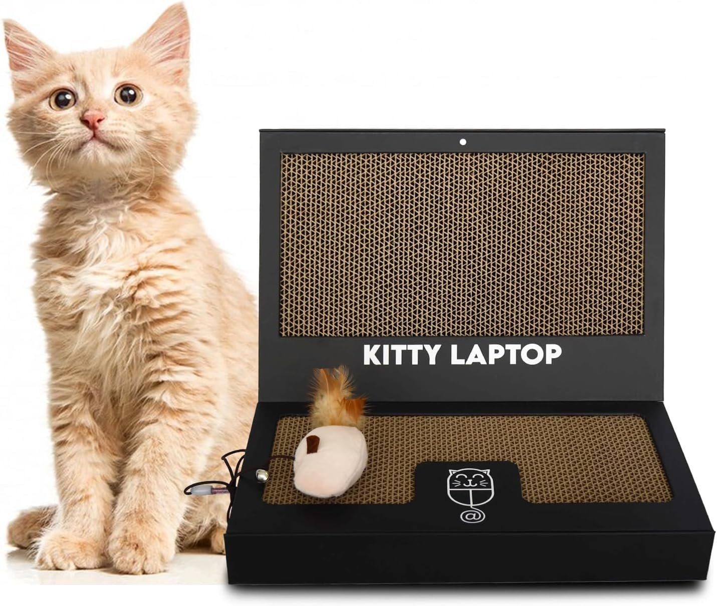Key features of the Kitty Laptop: dual scratchboards, catnip-filled ‘mouse’, plus 50 fun cat stickers as an added bonus!