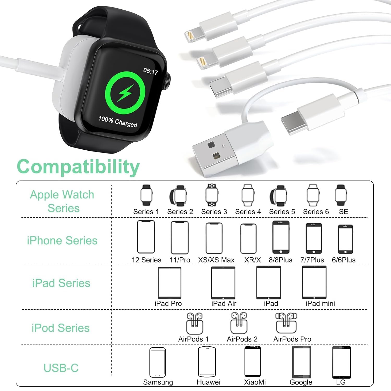 【Durable&Portable】6 in 1 watch charger cable is made of high-quality materials to improve charging, ensuring excellent charging performance. This 6ft/1.8m watch fast charger cable kit features a lightweight and portable design, very easy to fit in your travel bag or pocket to take it on the go or simply use at home and office, charge your watch or phone anywhere anytime.