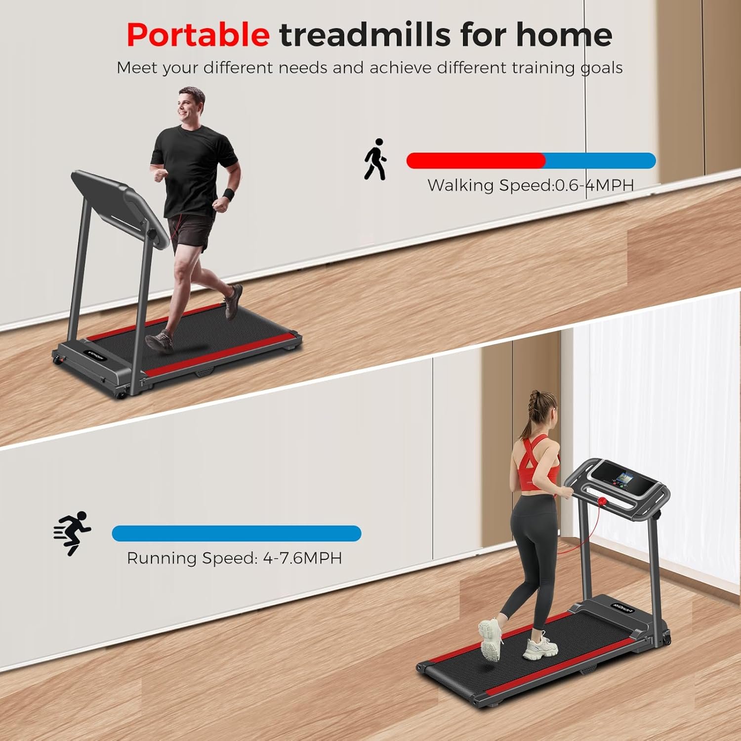 【Powerful Motor】This folding treadmill with max 3.0 HP powerful motor, operate in less than 55 db, and speeds of 0.6-7.6 MPH, supports up to 300 lbs capacity, provides efficient, reliable operation. Perfect for walking, jogging and running
