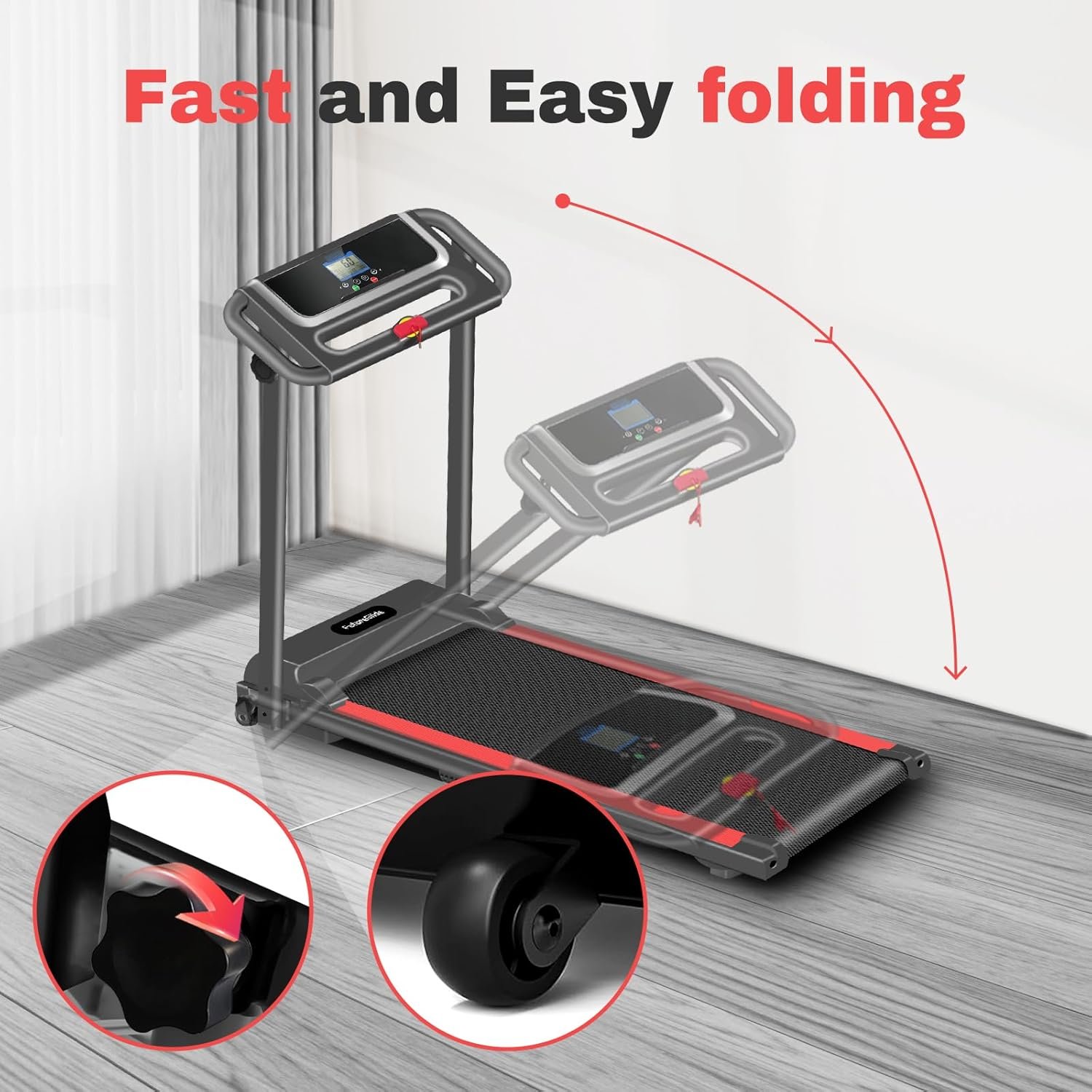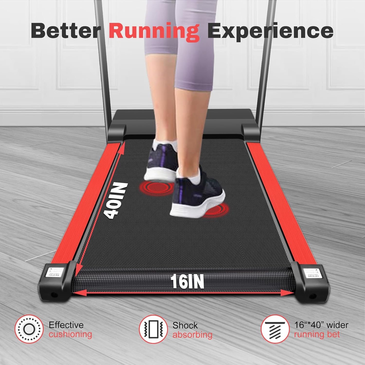 【Compact and Lightweight】This compact treadmill for home has a lightweight design, with movable wheels for easy moving, folding and storage. The folded size is 48” x 22” x 5.5”, suitable for use in small spaces. The running belt size of this small treadmills is 40” x 16”, with shock absorbing and non-slip design to provide you with a comfortable exercise experience. In addition, has emergency stop and handles, providing convenience for your exercise