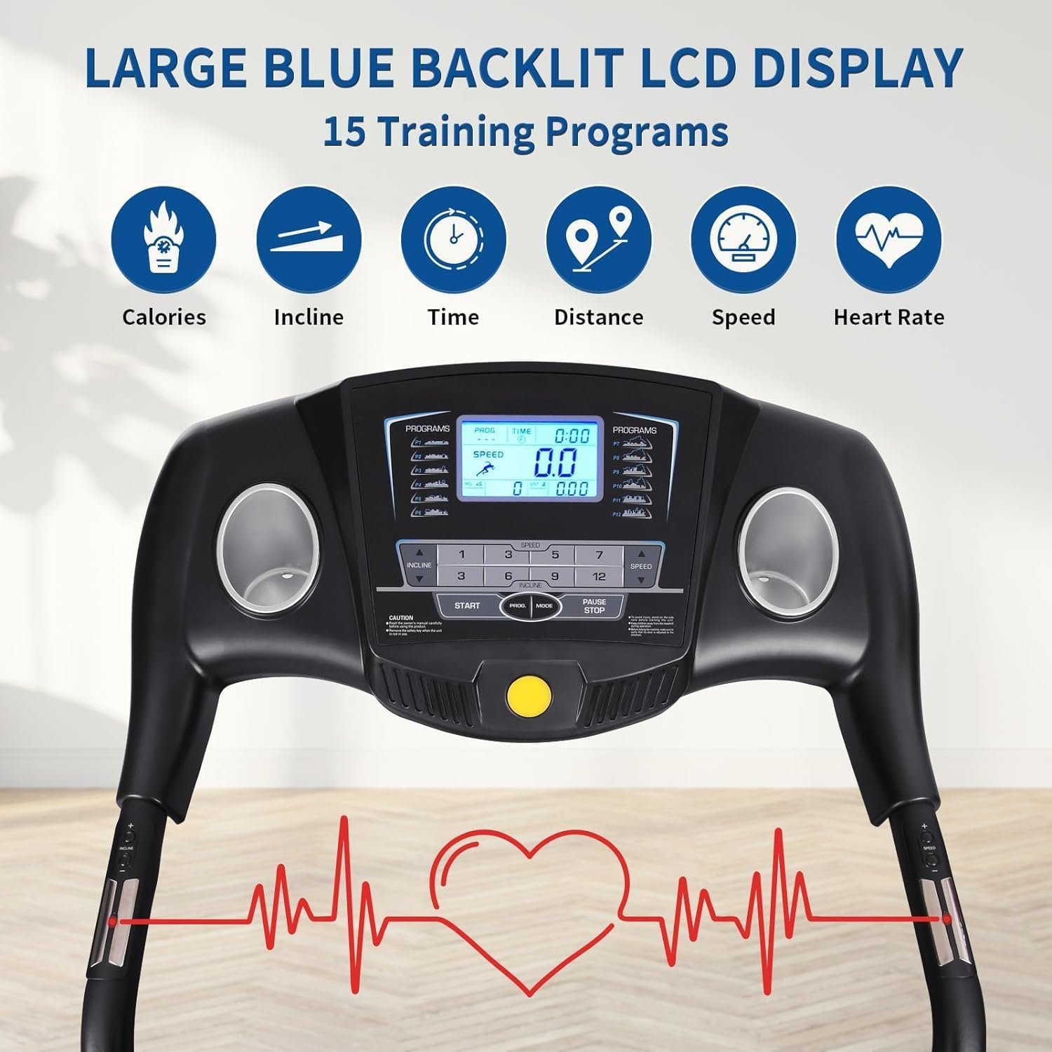 Multi-Functional Display And Heart Rate Sensor: The folding treadmill with Large blue backlit LCD Display can track your Time, Speed, Distance, Calorie, Incline, Heart Rate, Program and Modes. What‘s more, the handlebars of the treadmill also come with heart rate sensors, enabling you to monitor your heart rate during a workout. This treadmills for home provides a comprehensive display of various workout data, allowing you to fully understand your exercise status