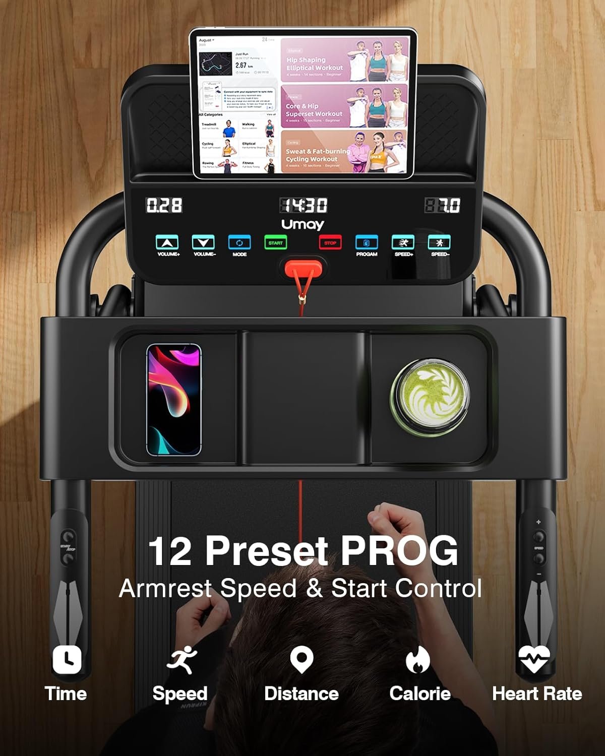 【Multi-function Console】The smart treadmill is equipped with a multifunctional console for controlling start/stop, speed, and built-in Bluetooth audio volume. It offers 12 preset scientific running programs to suit various needs. Three LED screens display real-time workout data, including time, distance, calories, speed, and heart rate. There’s ample storage space for items such as water bottles, cell phones, and tablets, ensuring a comprehensive workout experience.