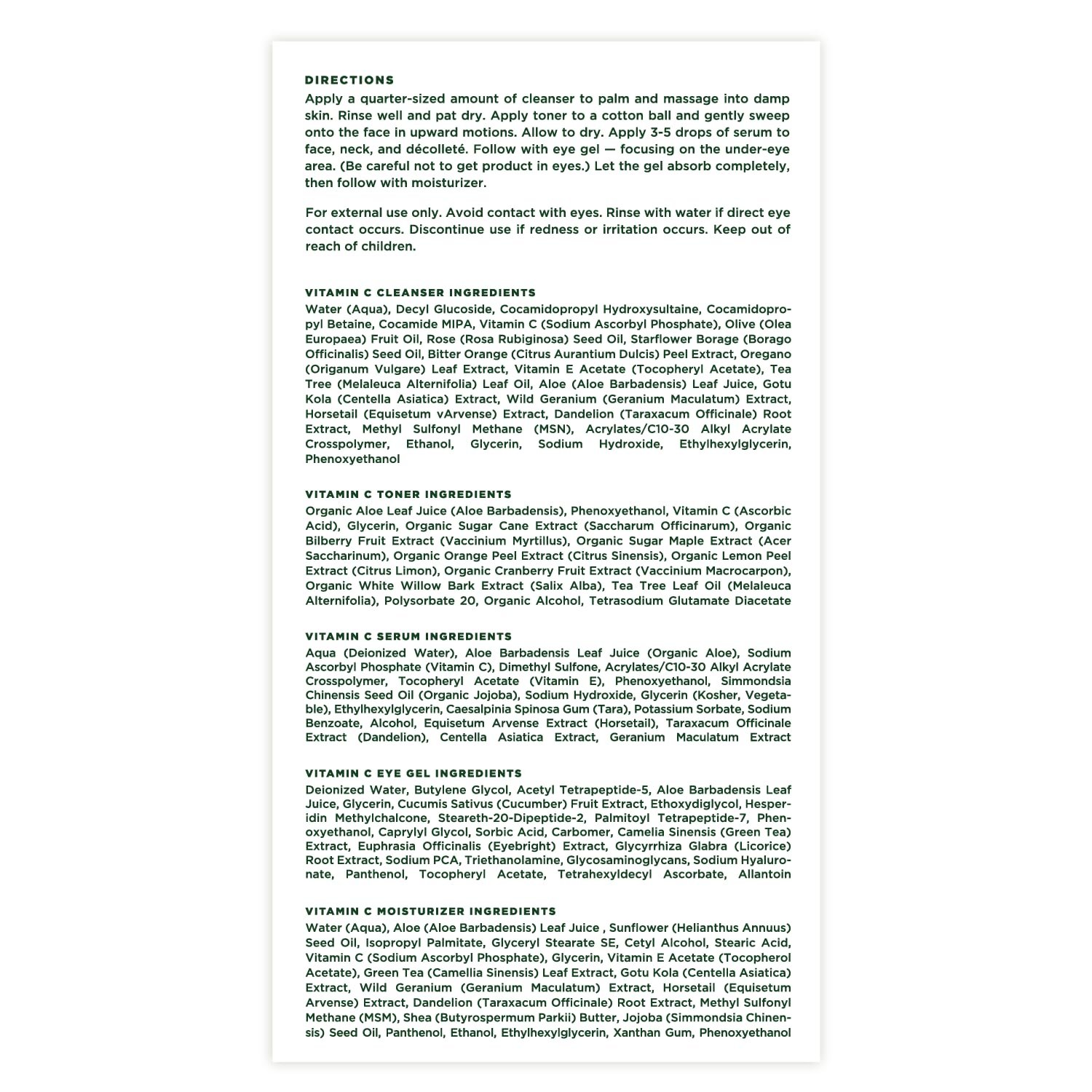 Our full Vitamin C collection for your brightest, smoothest skin yet. The Vitamin C Cleanser gently removes impurities, brightens, and moisturizes; while Vitamin C Toner lifts away excess oil, makeup, and residue.The Vitamin C Serum brightens, reduces the look of dark spots, and evens the skin tone. Vitamin C Eye Gel minimizes the appearance of dark circles, puffiness, and fine lines. Vitamin C Moisturizer visibly brightens as it hydrates and softens.