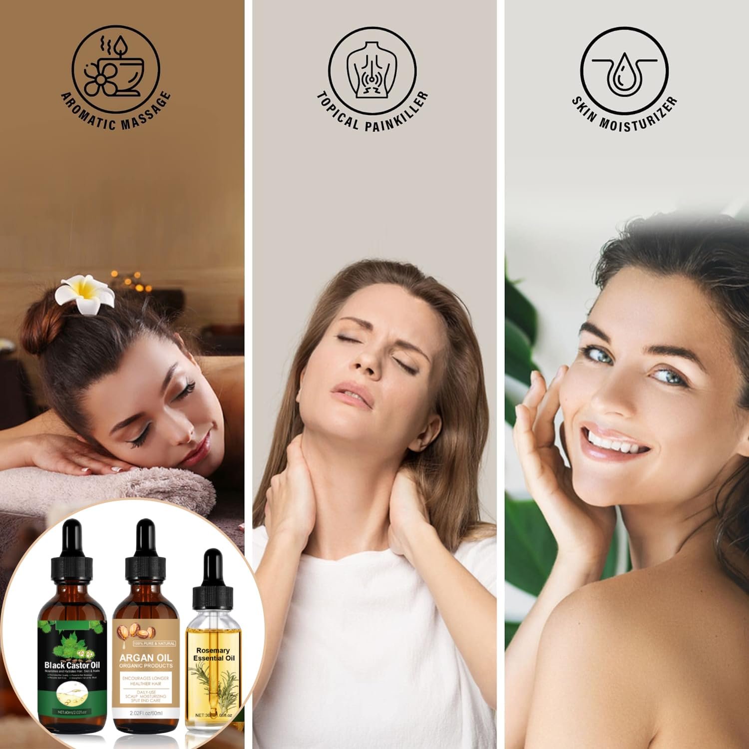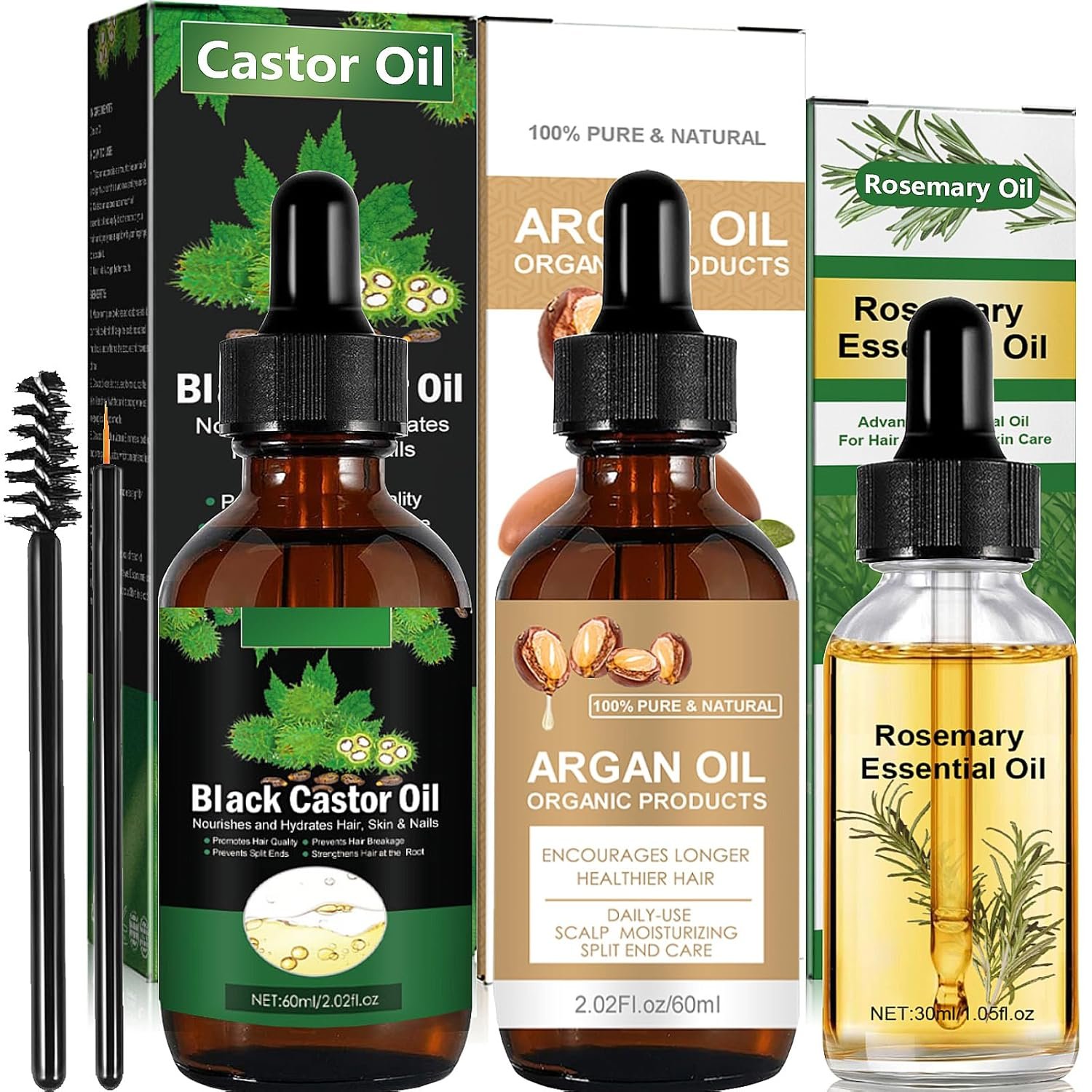 100% Castor Oil:Jamaican black castor oil is 100% pure cold-pressed purification technology, unrefined, hexane free, GMO-free, preservative-free, all-natural and organic, rich in vitamin E minerals.(List: Castor Oil ×1Bottle 2.02 Fl Oz,Argan Oil ×1Bottle 2.02 Fl Oz,Rosemary Oil ×1Bottle 1.01 Fl Oz)