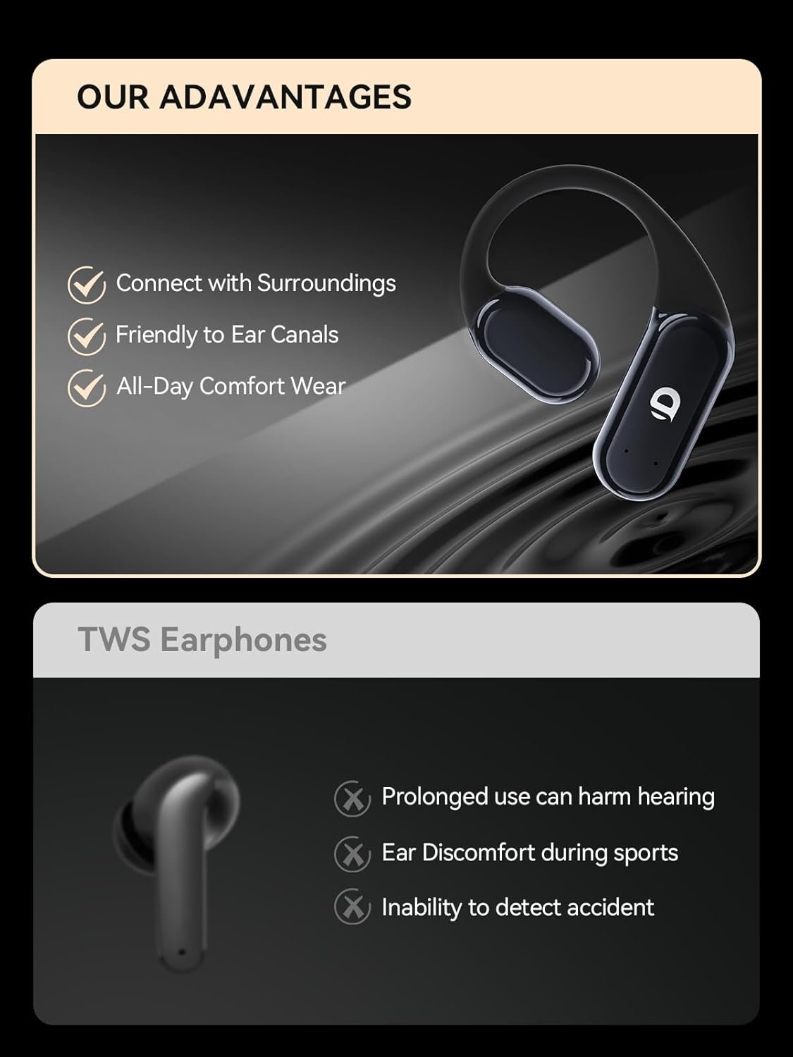 ✅【0.28oz Light, All-Day Comfort】 – Each earbud weighs just 0.28 ounces, featuring a 0.7mm memory-flex titanium alloy frame and skin-friendly silicone for a delicate appearance. Robust yet comfortable, it offers seamless, all-day wear.The titanium alloy frame adapts to ear curves, ensuring optimal shape retention for prolonged wear. The skin-friendly silicone, with its soft touch and medical-grade clean properties, fosters high skin adhesion, eliminating discomfort for a healthier all-day wear.