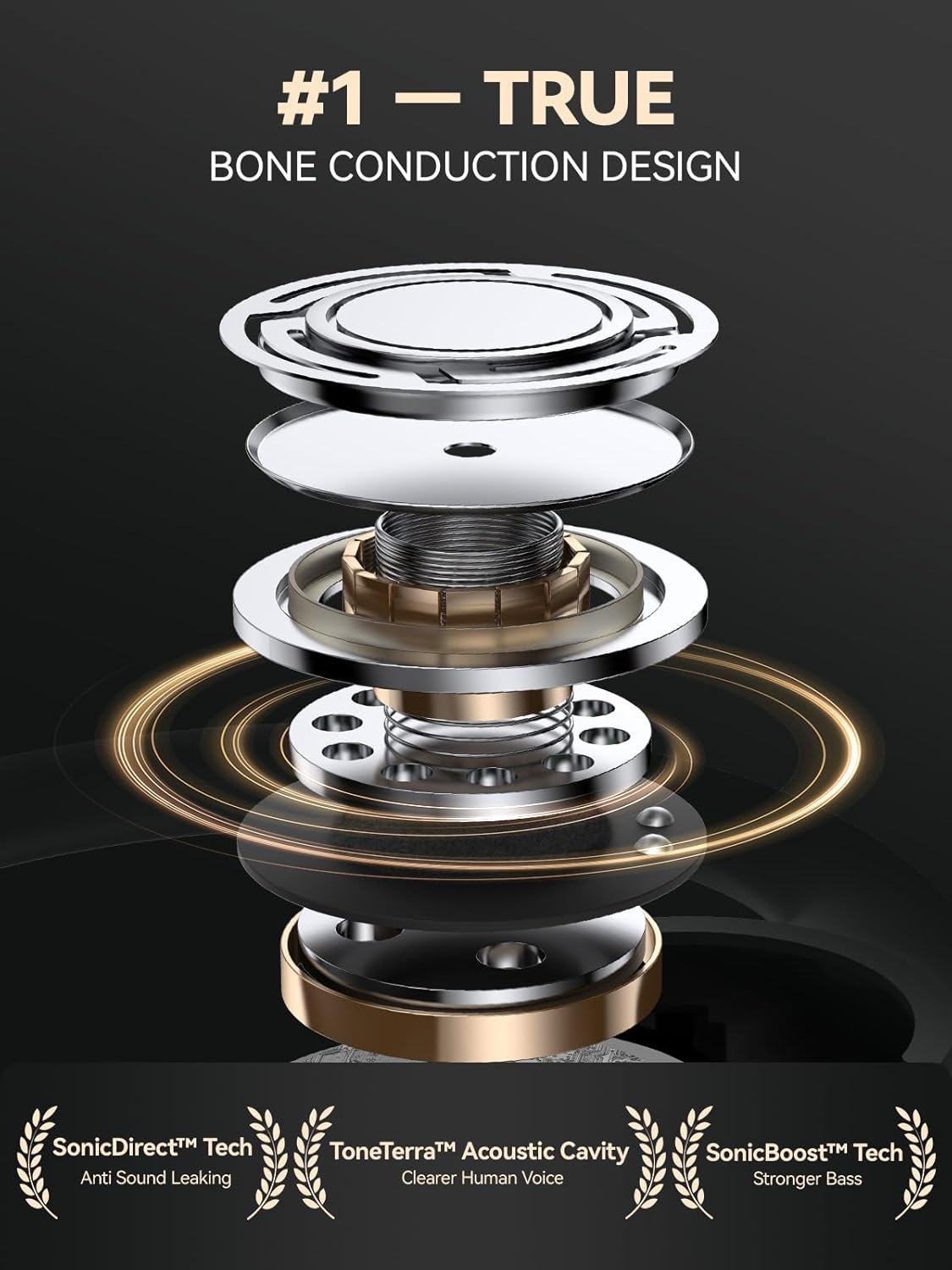✅【Genuine Bone Conduction, Not Air Conduction】 – Our Open-Ear headphones are the world’s FRIST ONE that feature an 11mm acoustic driver in true bone conduction design for powerful and authentic audio. SonicDirect Tech inside ensures clear audio direction without sound-leaking, protecting privacy. With our ToneTerra acoustic cavity and SonicBoost digital sound enhancement tech, the designed acoustic space offers clear and distinct HI-FI sound, optimizing audio performance for a more realistic auditory experience.
