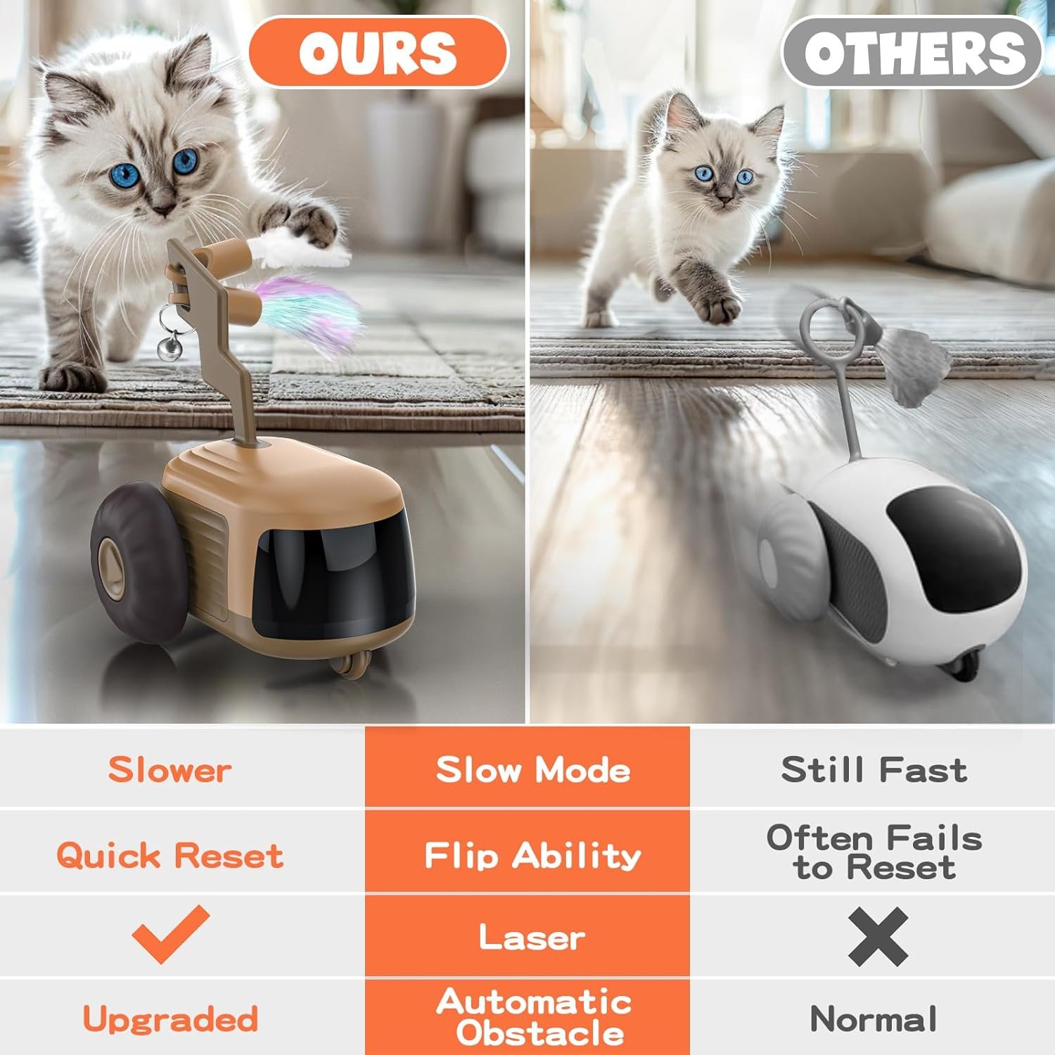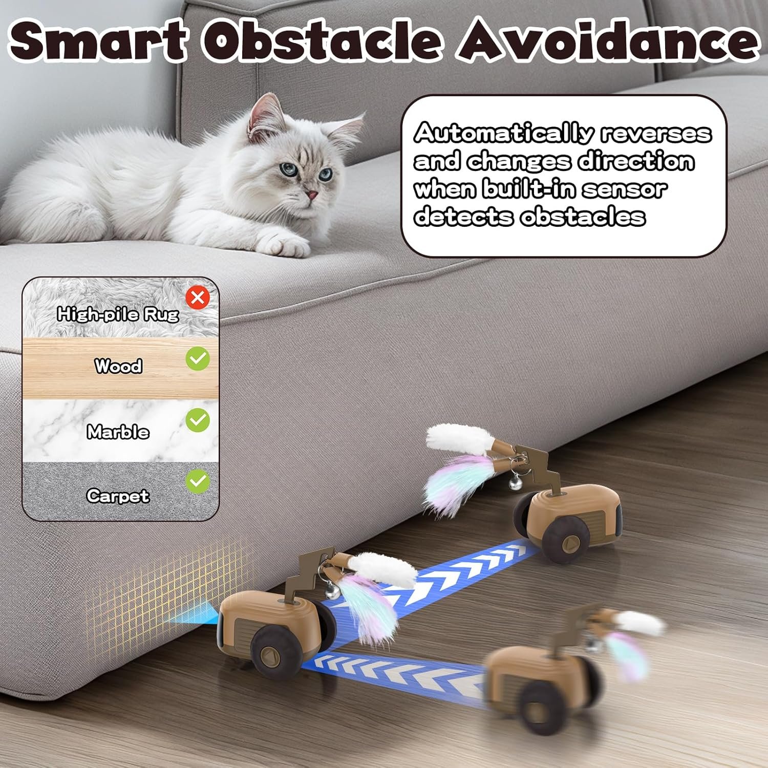 Intelligent Barrier Avoidance & Auto-Rotate: Our cat interactive toys has built-in sensors that automatically back up and change direction when they detect obstacles ahead, re-planning the route. If the toy overturns, the wheels will automatically flip and adjust the position of the car body to return the car to the correct position and operate normally.